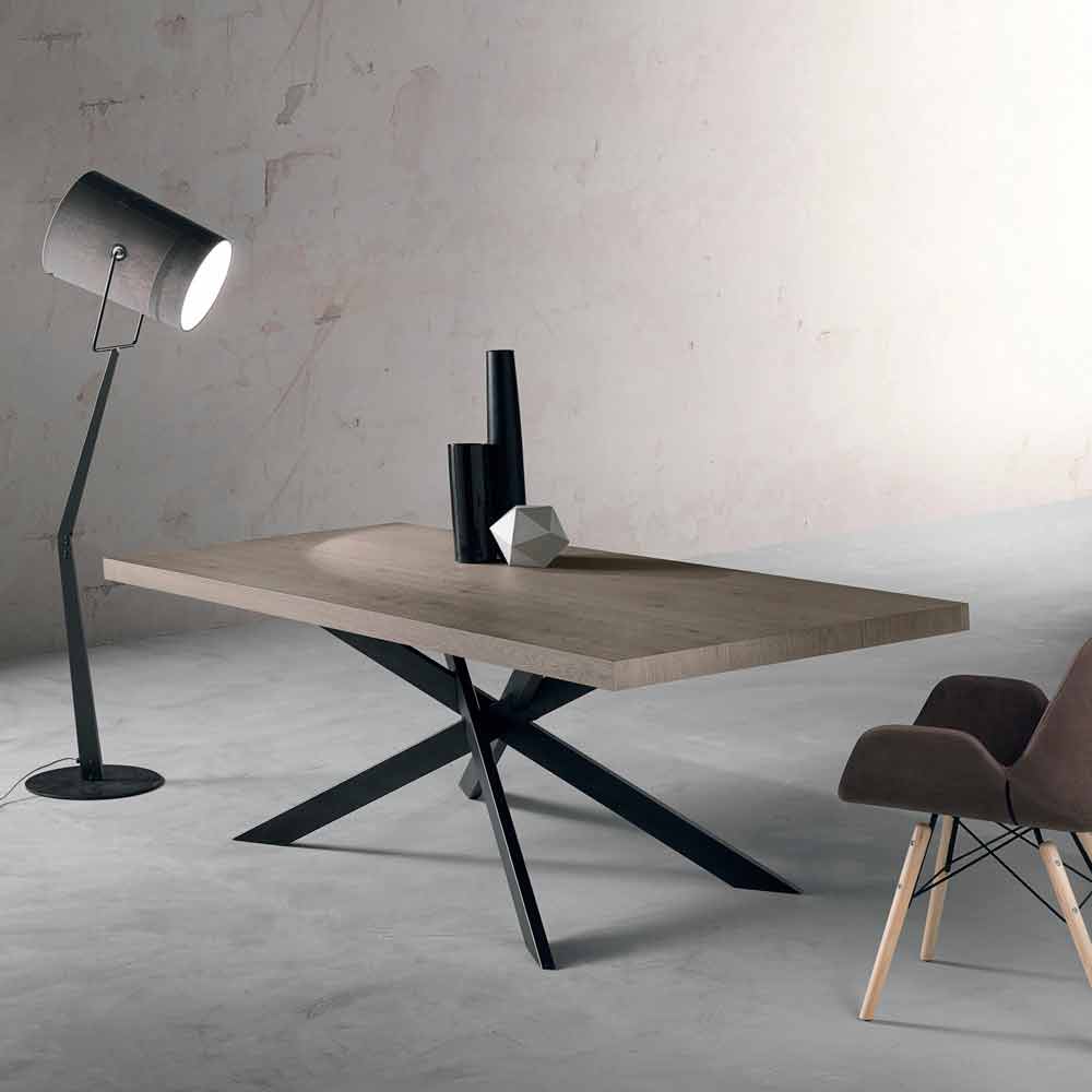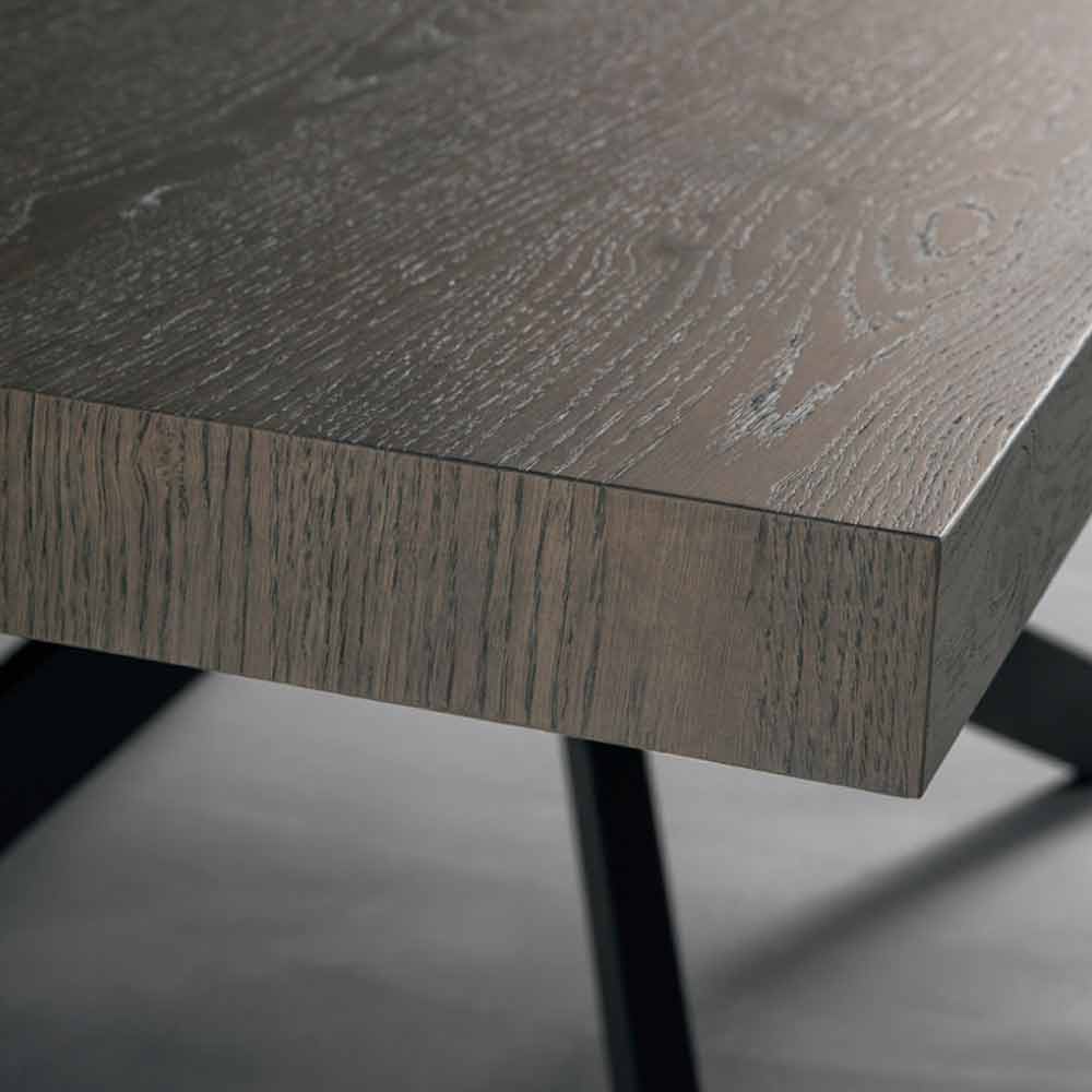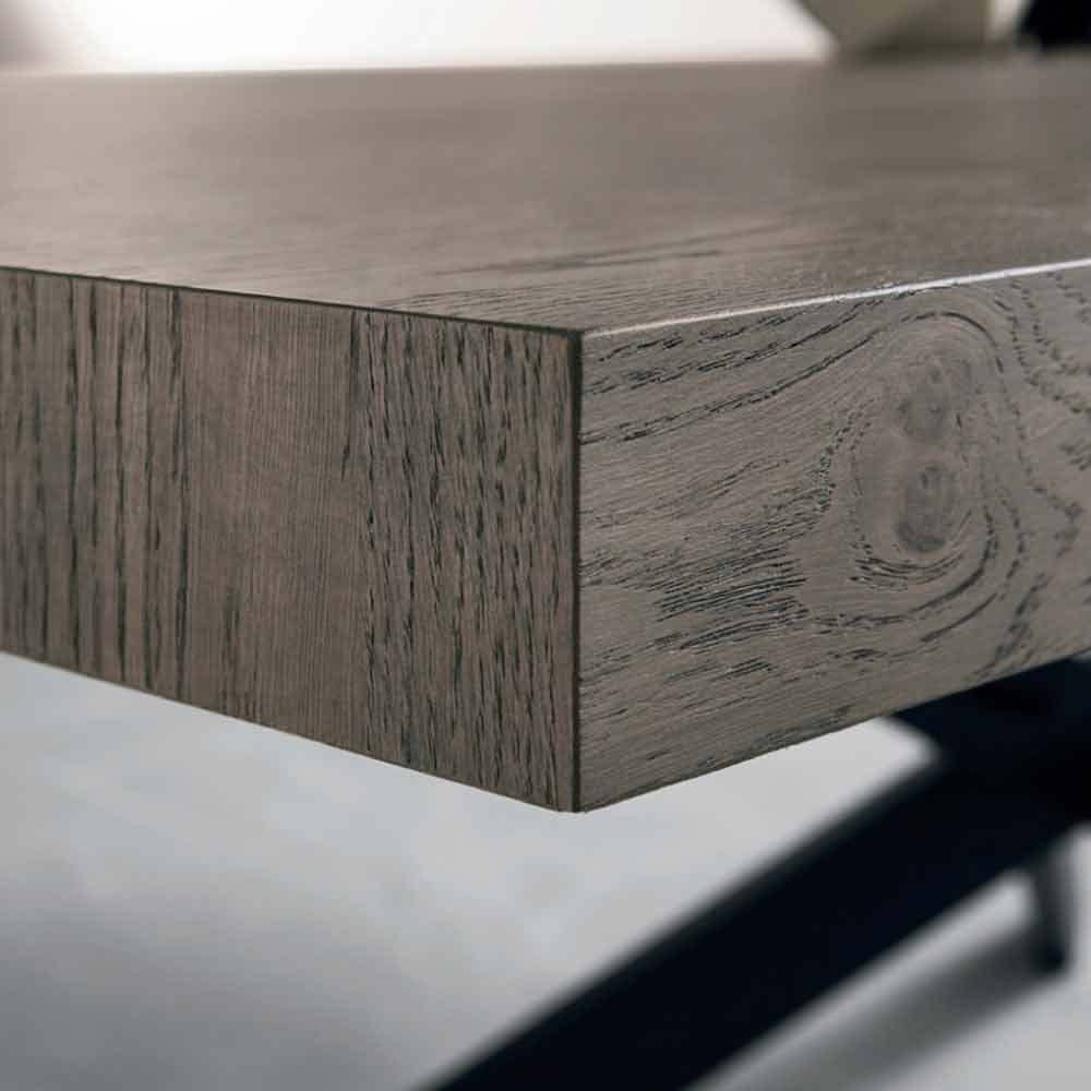 Producido exclusivamente en Italia con materiales de la marca made in Italy. Su tapa es de chapa de roble anudada obtenida con el proceso de Plegado, de 60mm de espesor. La estructura es de metal acabado micrograbado antracita con tubos cruzados y pies regulables.