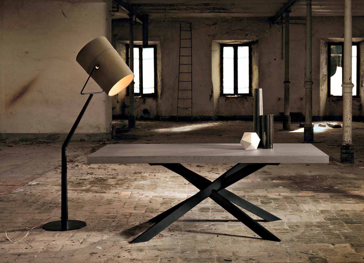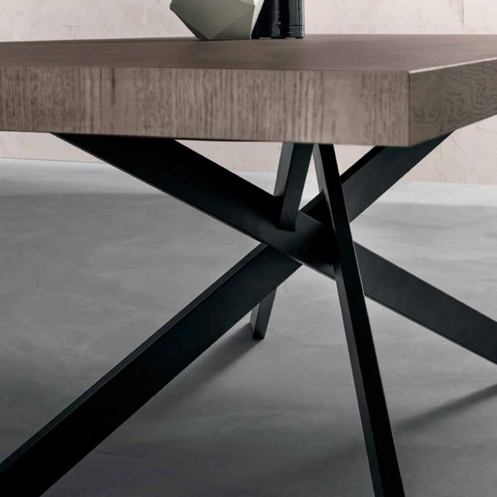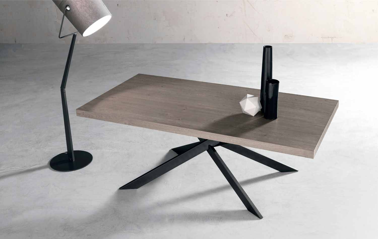 Producido exclusivamente en Italia con materiales de la marca made in Italy. Su tapa es de chapa de roble anudada obtenida con el proceso de Plegado, de 60mm de espesor. La estructura es de metal acabado micrograbado antracita con tubos cruzados y pies regulables.