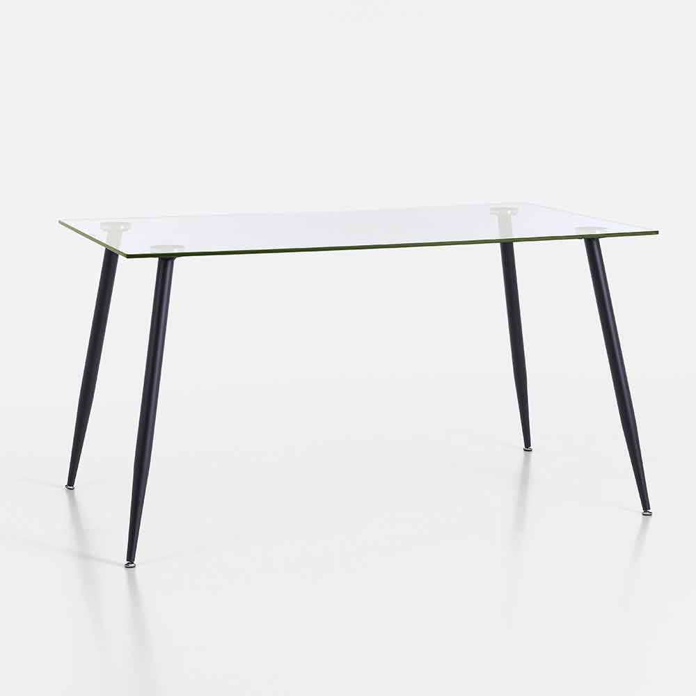 Mesa de salón de diseño moderno con tapa de cristal templado y base de metal pintado en negro mate.