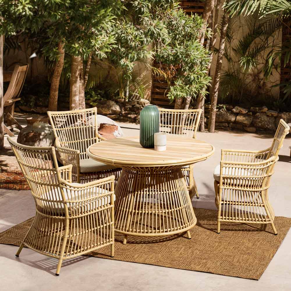 Esta mesa de jardín es una auténtica obra maestra de diseño y funcionalidad . De forma orgánica y líneas limpias, es un elemento de decoración que destaca por su estilo y elegancia , perfecto para celebrar comidas y cenas al aire libre. El tablero de la mesa está fabricado en madera, lo que garantiza una notable durabilidad y un fácil mantenimiento. La base de aluminio con efecto ratán crea un efecto visual de ligereza y apertura , permitiendo que la mesa se integre perfectamente con el entorno, ya sea el verdor del jardín o la terraza de una casa moderna. No es sólo una mesa, sino un punto de encuentro , donde diseño y naturaleza se funden para crear momentos inolvidables.