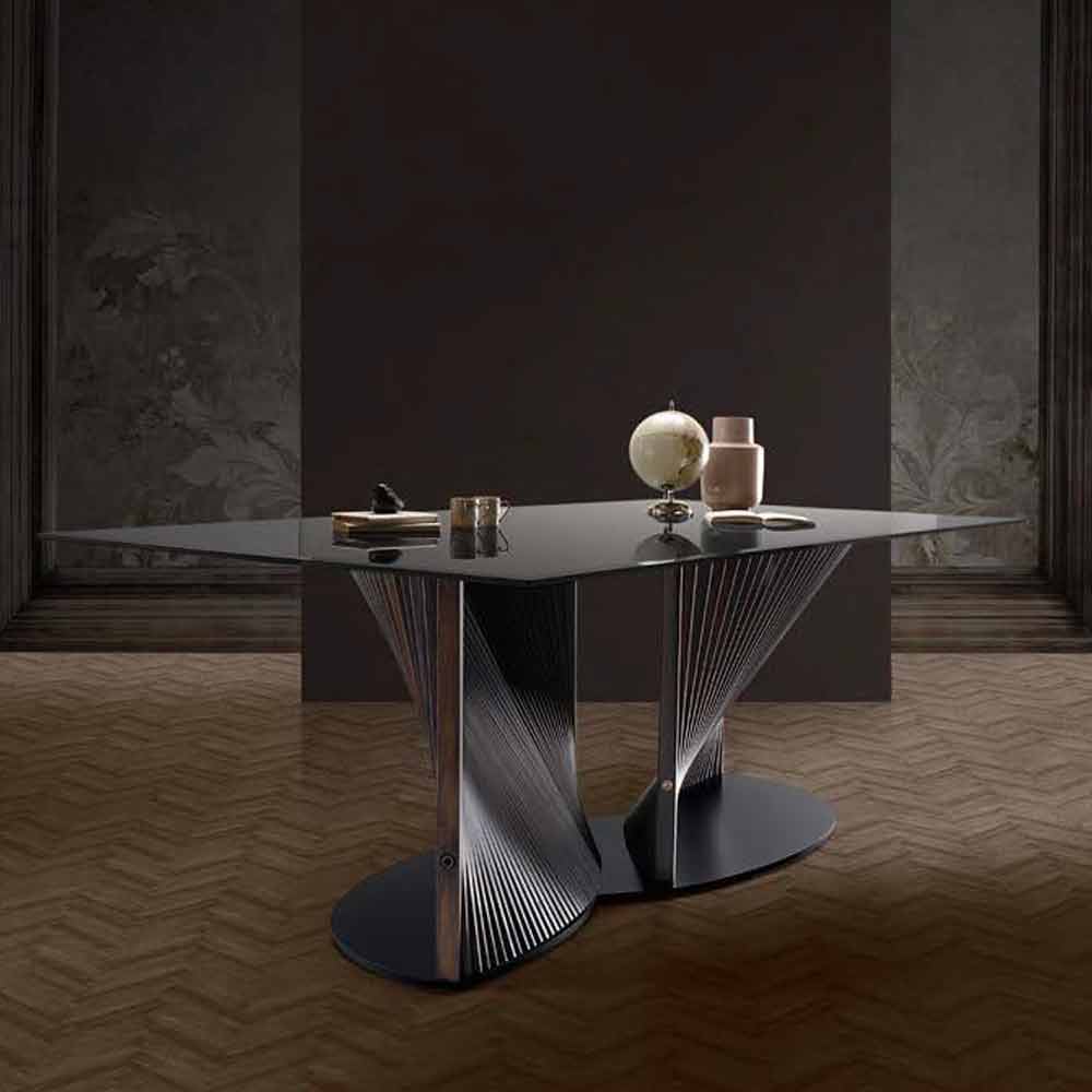 Mesa de comedor de elegante diseño fabricada en vidrio ahumado y madera, de alta calidad Made in Italy.