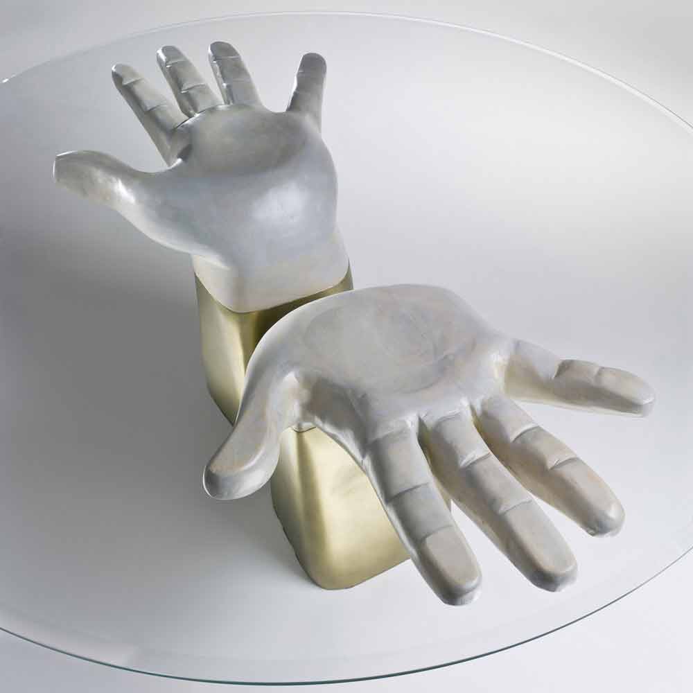 Mesa de comedor de madera con tapa de cristal, hecha en Italia, Bartolo Lujo, creatividad y elegancia se unen en la mesa Bartolo , un mueble diseñado para los amantes del diseño Made in Italy. La estructura y el ornamento se realzan: la parte superior redonda de hecho está sostenida por las palmas de las dos manos, grandes ramas de madera talladas a mano con puños dorados que recuerdan las sugerencias pop. La parte superior está hecha de vidrio biselado. Una escultura real para la sala de estar. Mesa de comedor tallada con base formada por 2 manos de madera tallada, tapa de vidrio esmerilado de 15 mm. Disponible en dos acabados diferentes: seleccione el deseado del menú desplegable.
