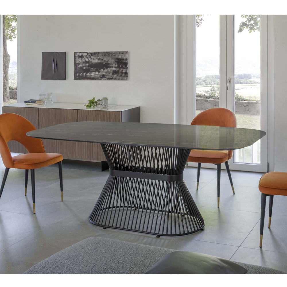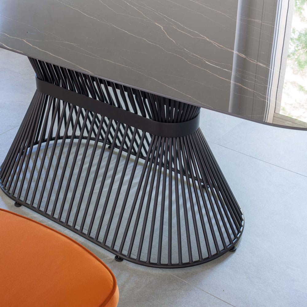 Mesa de comedor ovalada realizada con tapa de cerámica brillo florim (cerámica de 6 mm + melamina de 18 mm) y base de acero pintado en negro. Este artículo de diseño moderno es perfecto para incluir en zonas de estar, cocinas y salones con un estilo elegante y contemporáneo. La posibilidad de ampliarse significa que se adapta a todas las necesidades y ocasiones de uso, para invitar a amigos y familiares y crear momentos de convivencia únicos e inolvidables.