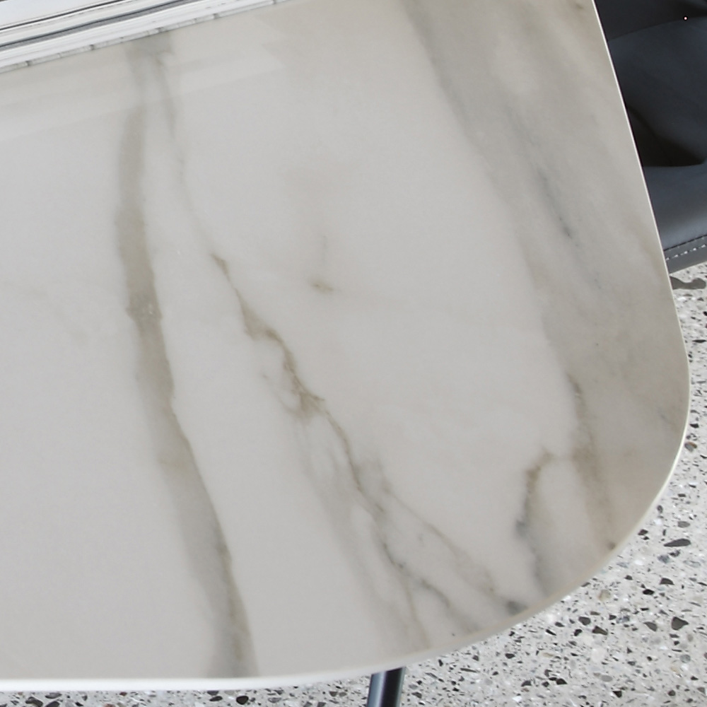 Mesa de comedor con base de acero pintado de negro y tapa elíptica realizada en cerámica florim brillo de 6 mm de espesor.Un producto robusto con un diseño exclusivo y moderno, ideal para quienes aman un estilo esencial y versátil , capaz de completar el mobiliario de su comedor o cocina con gusto y personalidad.