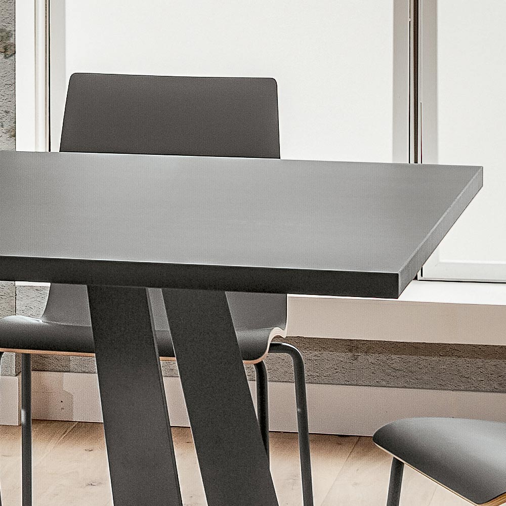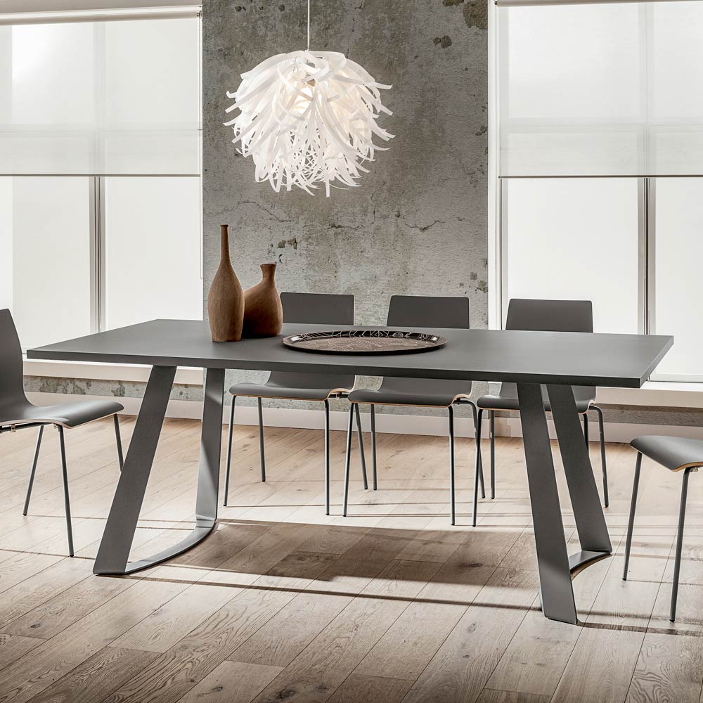Mesa de comedor fabricada en Italia con tapa en fenix y patas en metal pintado con polvos epoxi a juego con la tapa. Ideal para completar ambientes con un estilo extremadamente moderno, este complemento de líneas simples y minimalistas se caracteriza por la particular forma de las patas que otorgan a la mesa un estilo aún más original y refinado y dan vida a una solución de decoración exclusiva y ecléctica capaz de adaptarse a varios estilos de muebles modernos que complementan la atmósfera de la habitación de una manera creativa. Para aumentar su valor y prestigio está la mano de obra 100% Made in Italy y el uso de materias primas de alta calidad como el fenix que, mediante el uso de resinas innovadoras , ofrece una superficie resistente, agradable al tacto y extremadamente opaca , optimizando así la resultado final y maximizando su lado funcional.