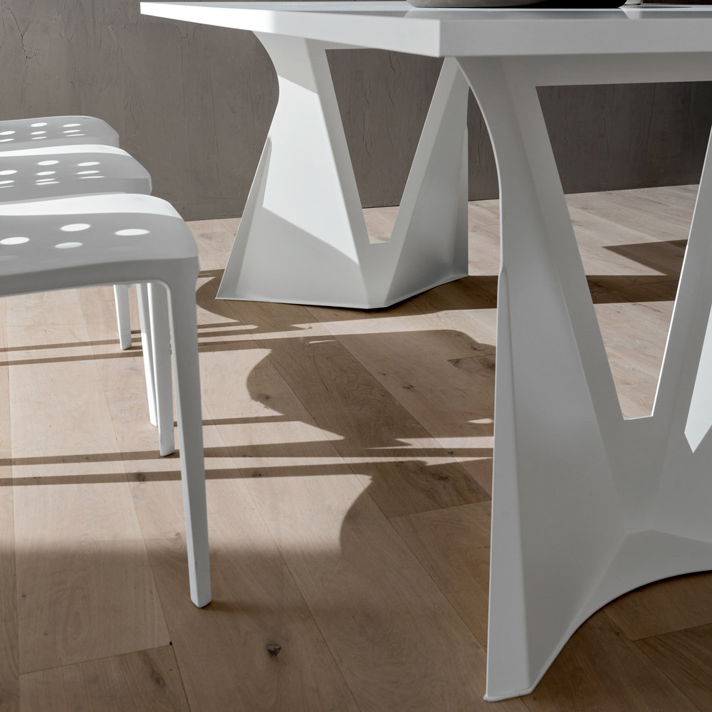 diseño imponente y majestuoso . Esta característica enriquece su estética junto con la forma inusual de las dos patas que le dan a la mesa un aspecto casi futurista, haciéndola especialmente adecuada para quienes aman decorar y enriquecer sus habitaciones con elementos con