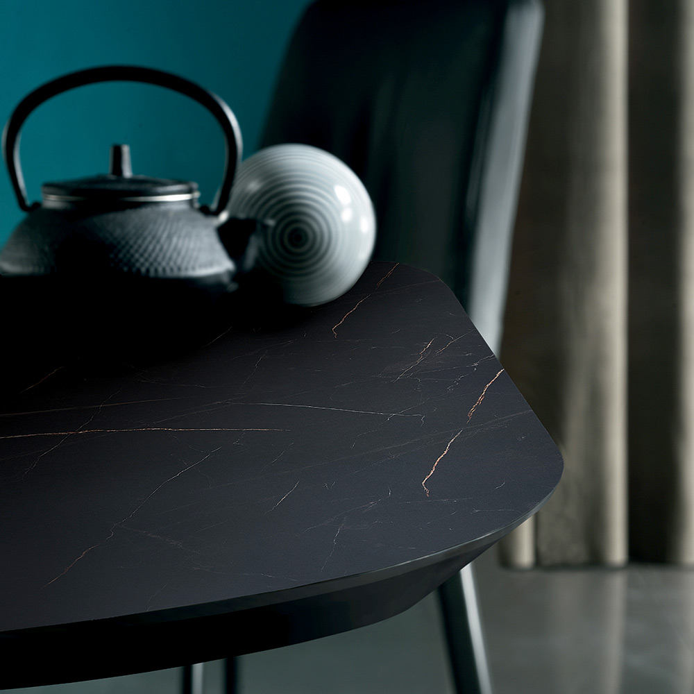diseño de estilo contemporáneo . La espléndida combinación de materiales elegidos y la particular forma de barril del tablero representan los elementos clave que enriquecen la estética de la mesa, elevando su calidad para un