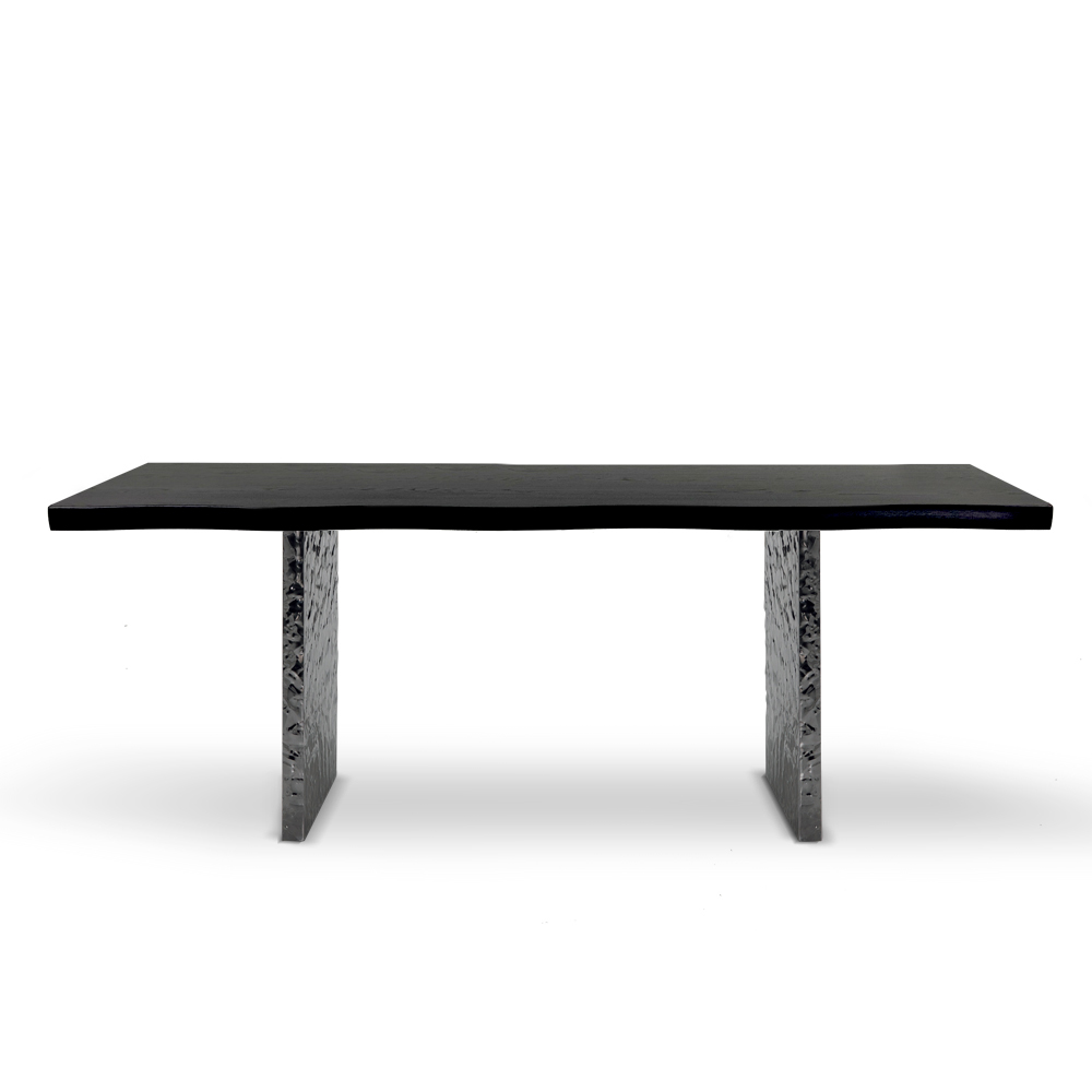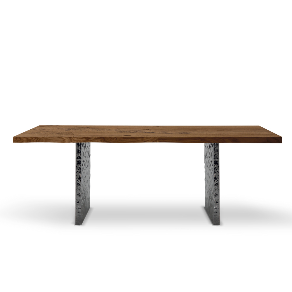 Mesa de diseño con tapa de madera chapada y base de acero martillado hecha a mano en Italia.