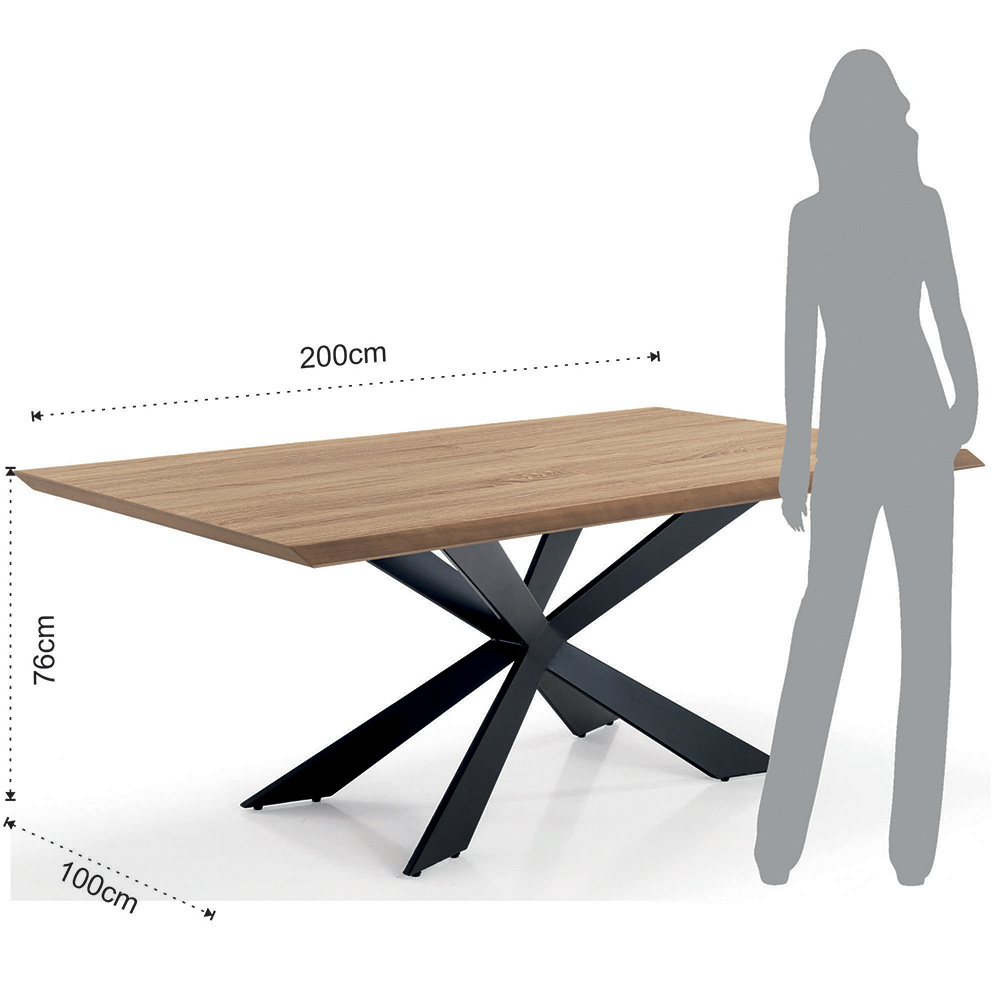 Mesa de comedor en mdf con acabado en roble y metal pintado negro.