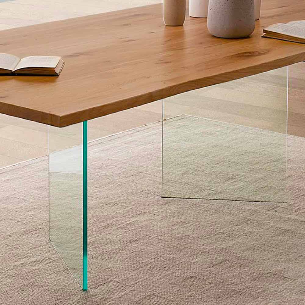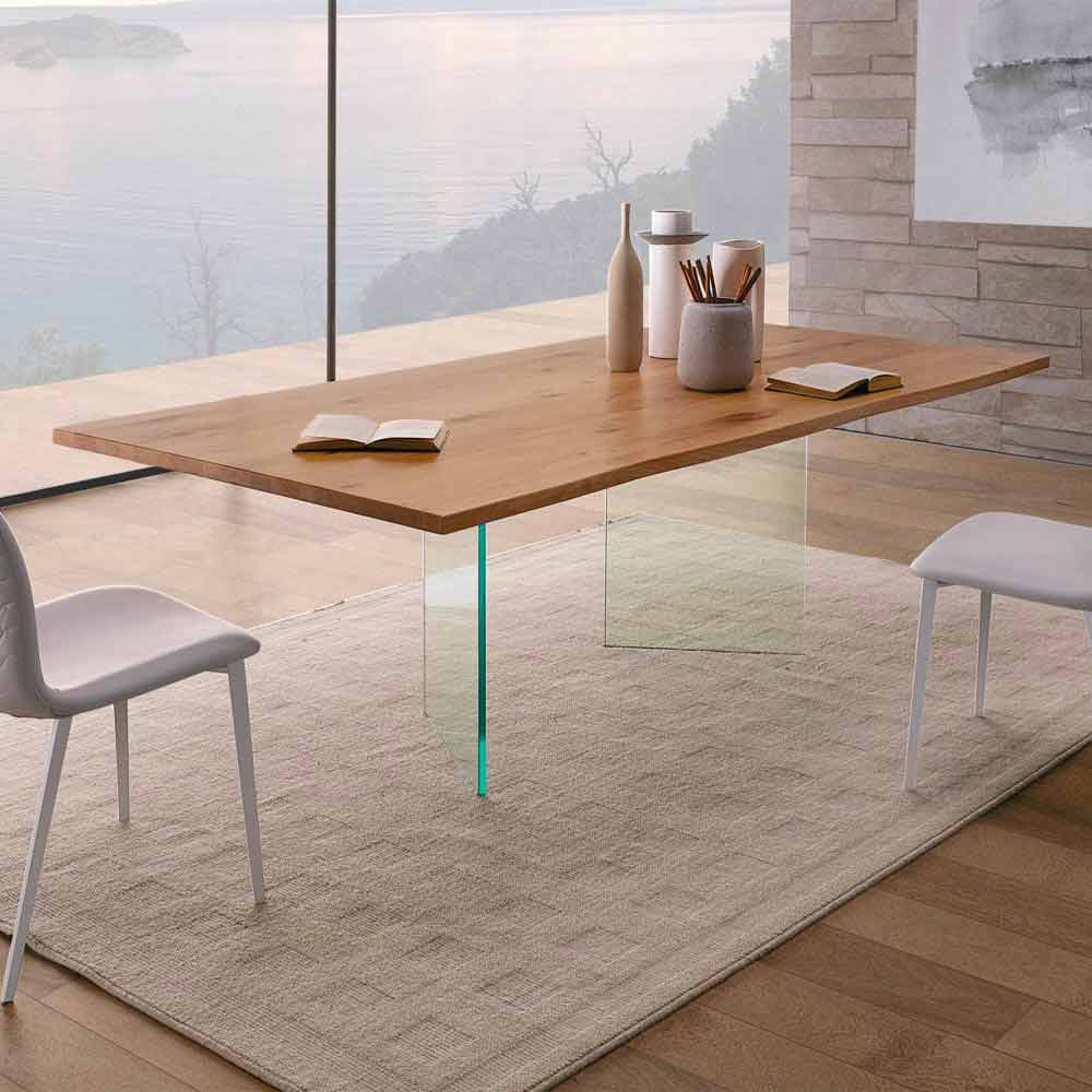 Esta mesa de comedor se caracteriza por un diseñoelegante y funcional que la hace perfecta para llenar espacios dentro de ambientes con un estilo contemporáneo y sofisticado. La peculiaridad de la mesa son sin duda las dos patas que dan la idea de que el tablero está casi suspendido, ya que están hechas de vidrio templado transparente de 1,5 cm de espesor , por lo tanto, delgado pero extremadamente sólido y resistente capaz de soportar el peso del tablero de madera de roble. rústico anudado . Hecho en Italia, el producto es extremadamente versátil y, gracias a la combinación de materiales y acabados disponibles, será capaz de llenar la habitación con la personalidad, conquistando el centro de atención.