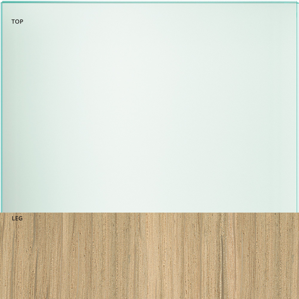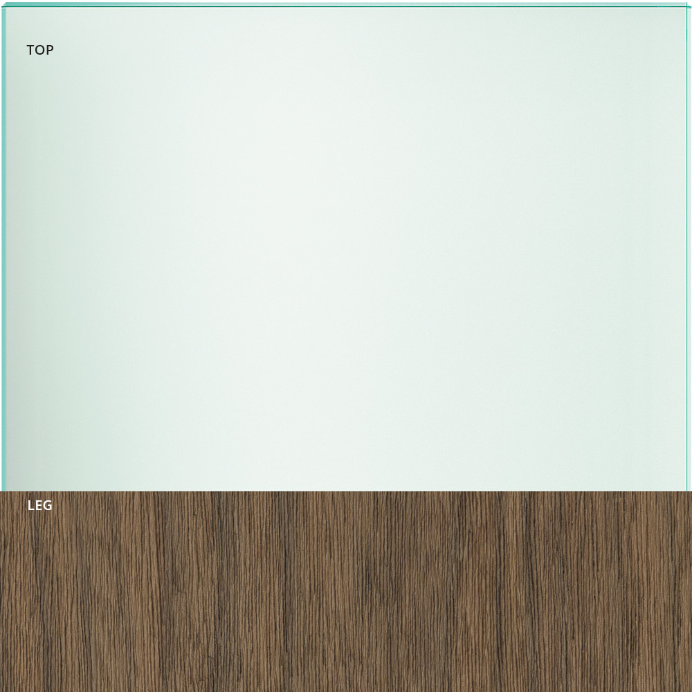 Esta mesa de comedor tiene un diseño esencial realizado con una tapa de cristal transparente y patas de madera disponible en dos acabados: roble o nogal canaletto.