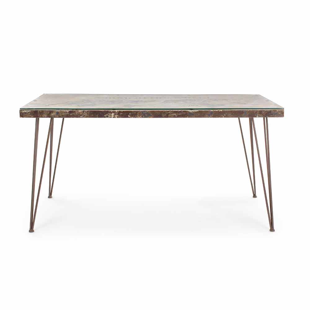 Mesa de comedor de estilo industrial con tapa de MDF y cristal y base de acero.