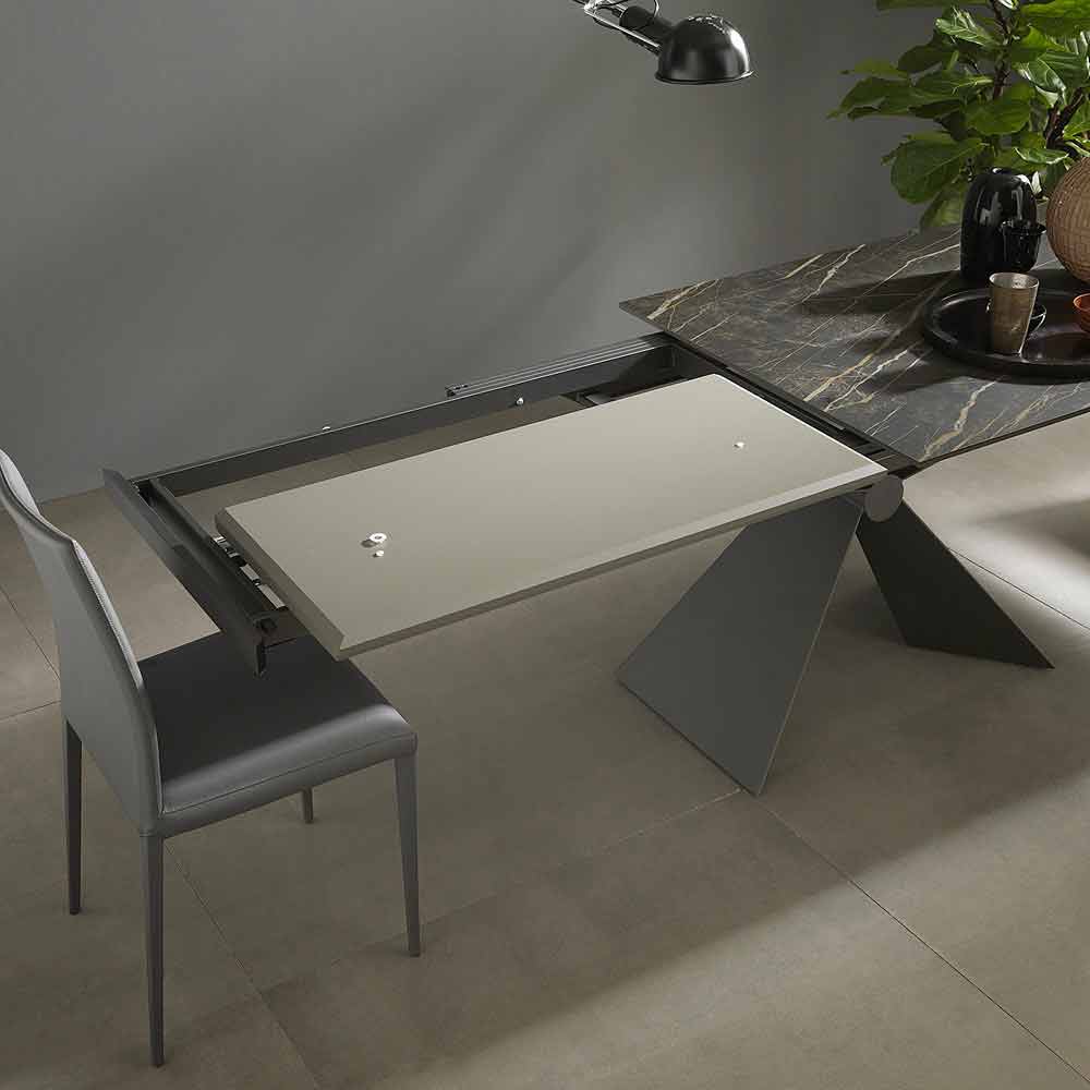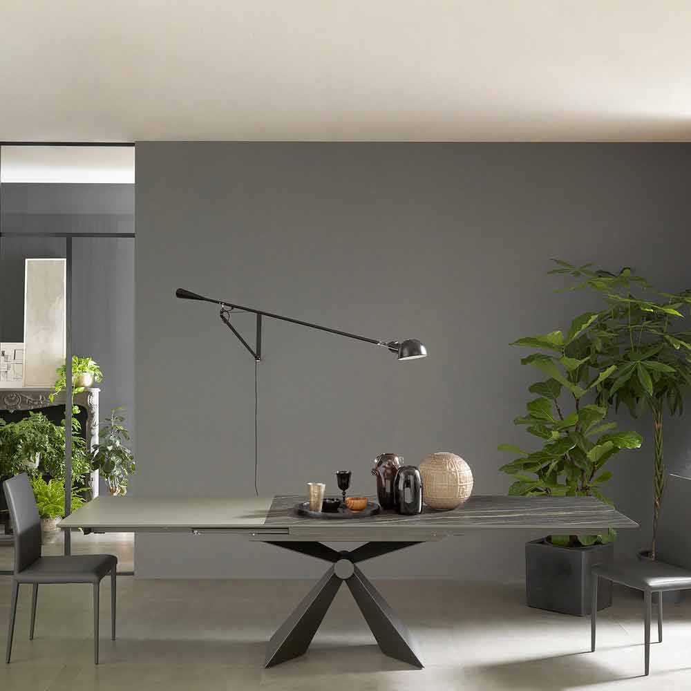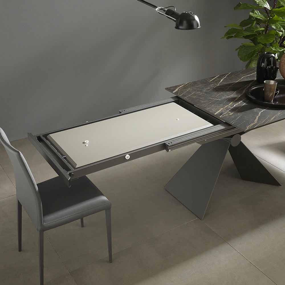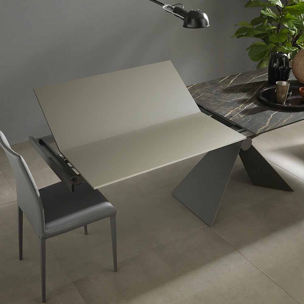 Base de mesa de comedor extensible con nudo de metal y tapa de cerámica hecha en Italia.