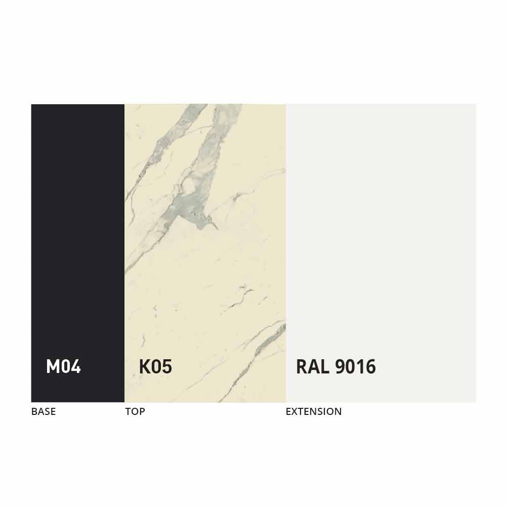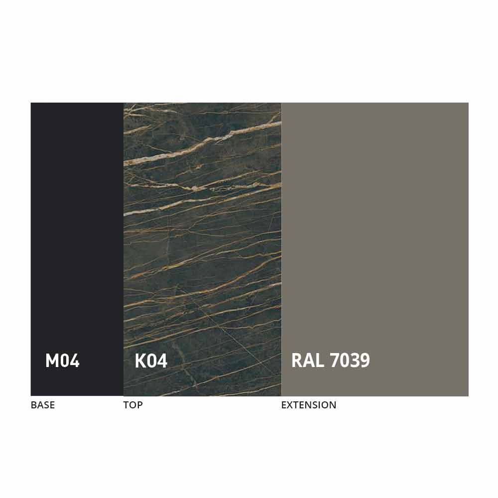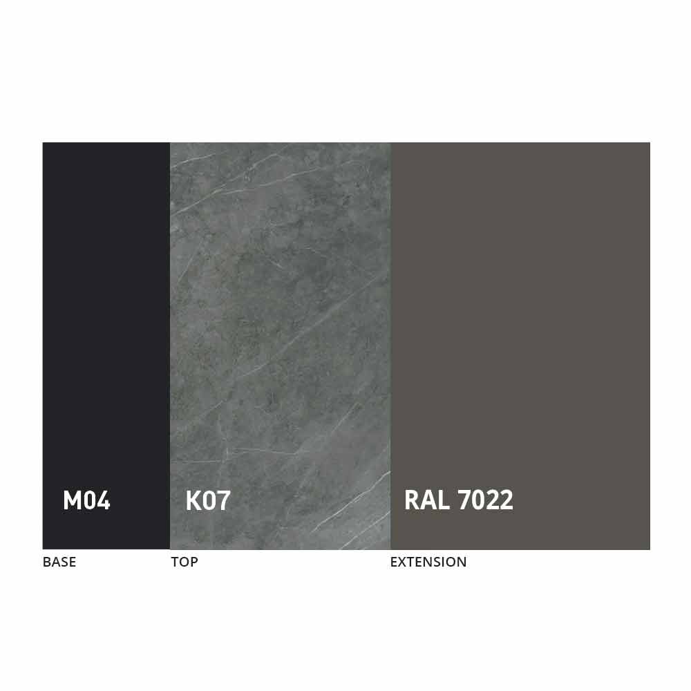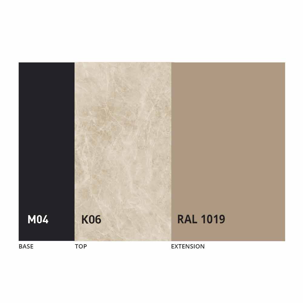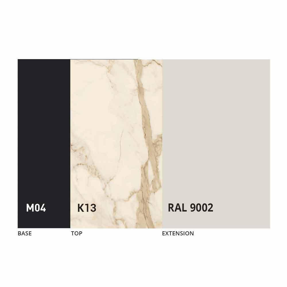 Realizada con una estructura de metal pintado en negro mate con 4 patas dobladas que soportan la tapa de fino panel mdf con laminam ceramic en la superficie, disponible en varios acabados.