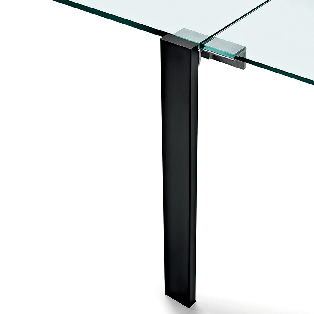 Mesa de cristal extraclaro extensible hasta 170 cm con base metálica, fabricada en Italia.