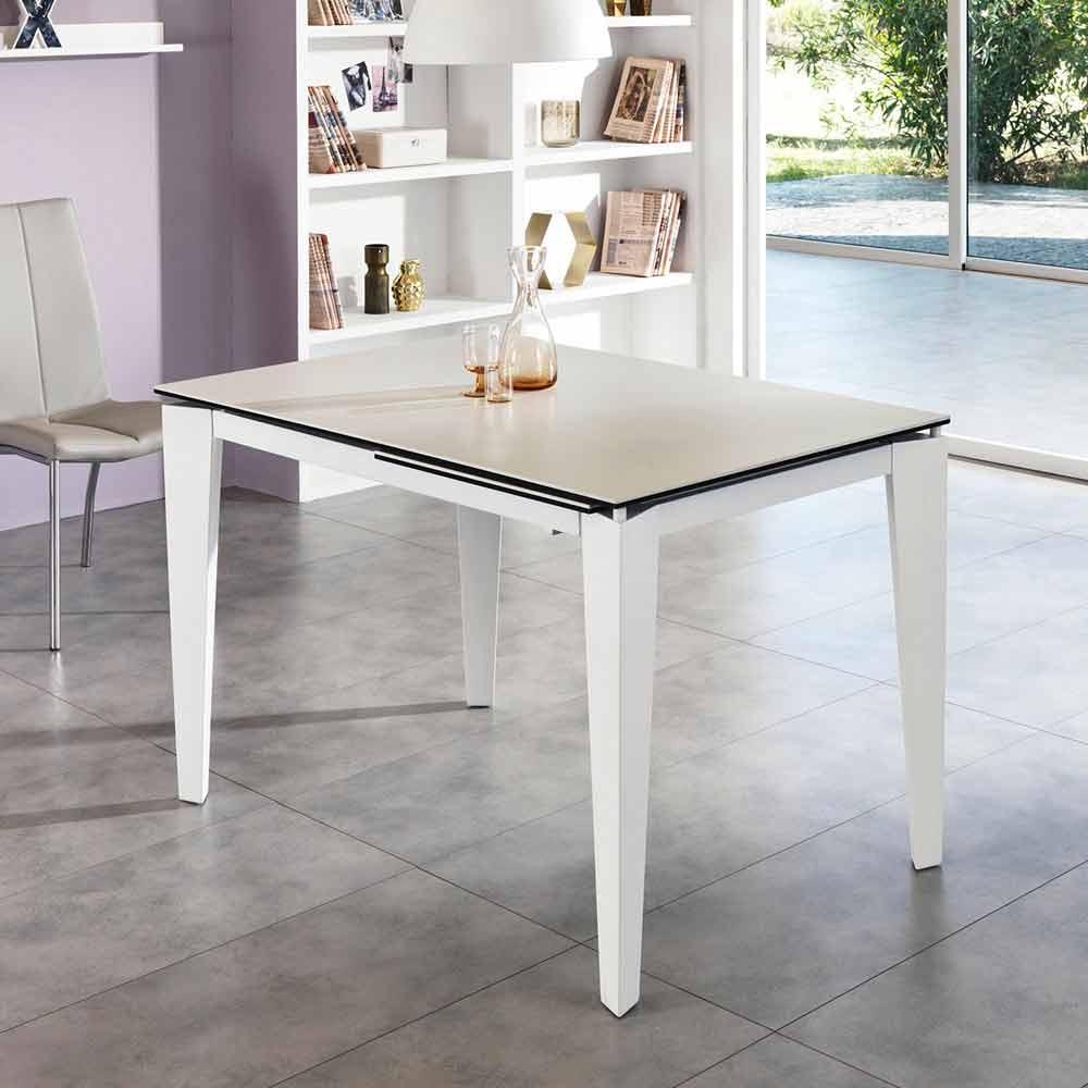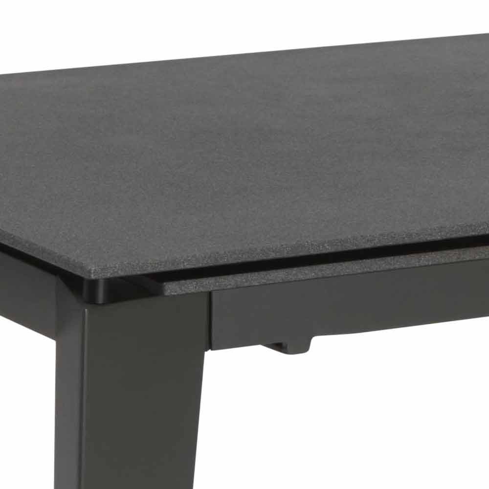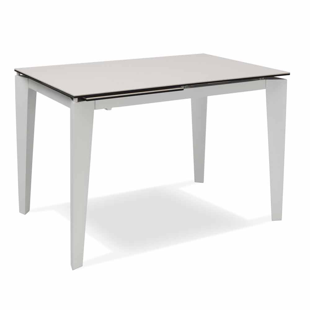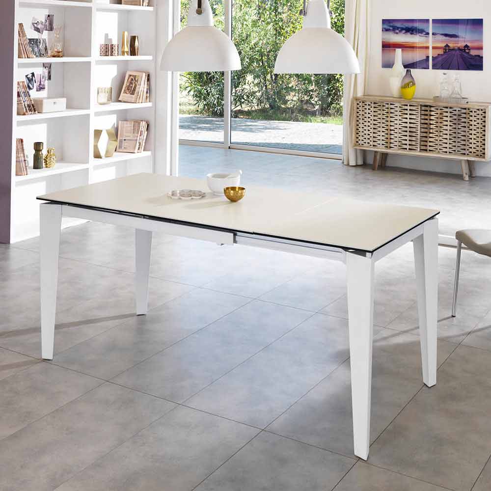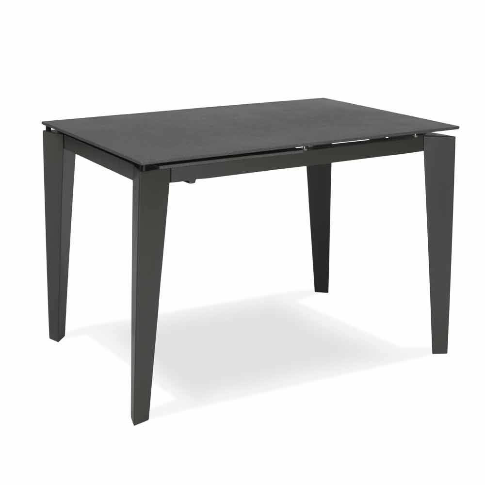 Mesa rectangular extensible con base de metal pintado mate. Tapa y extensión en vidrio y cerámica (capa inferior en vidrio, capa superior en cerámica). Gracias a la práctica extensión, es posible extender la mesa hasta una longitud de 170 cm.