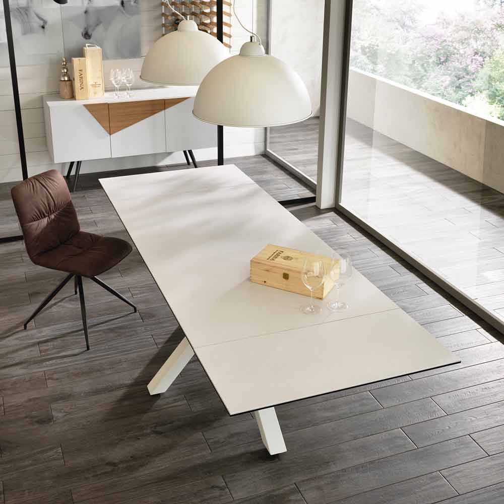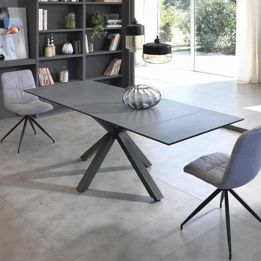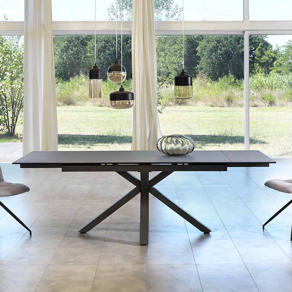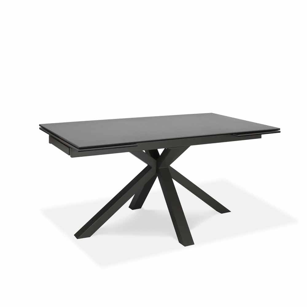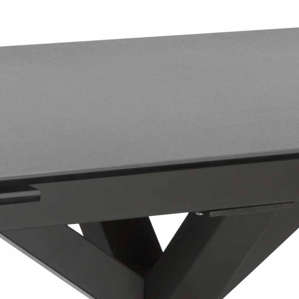 Mesa rectangular extensible con base de metal pintado mate. Tablero y extensiones en vidrio y cerámica (capa inferior en vidrio + capa superior en cerámica). Dos prácticas extensiones le permiten extender la mesa hasta una longitud de 240 cm.