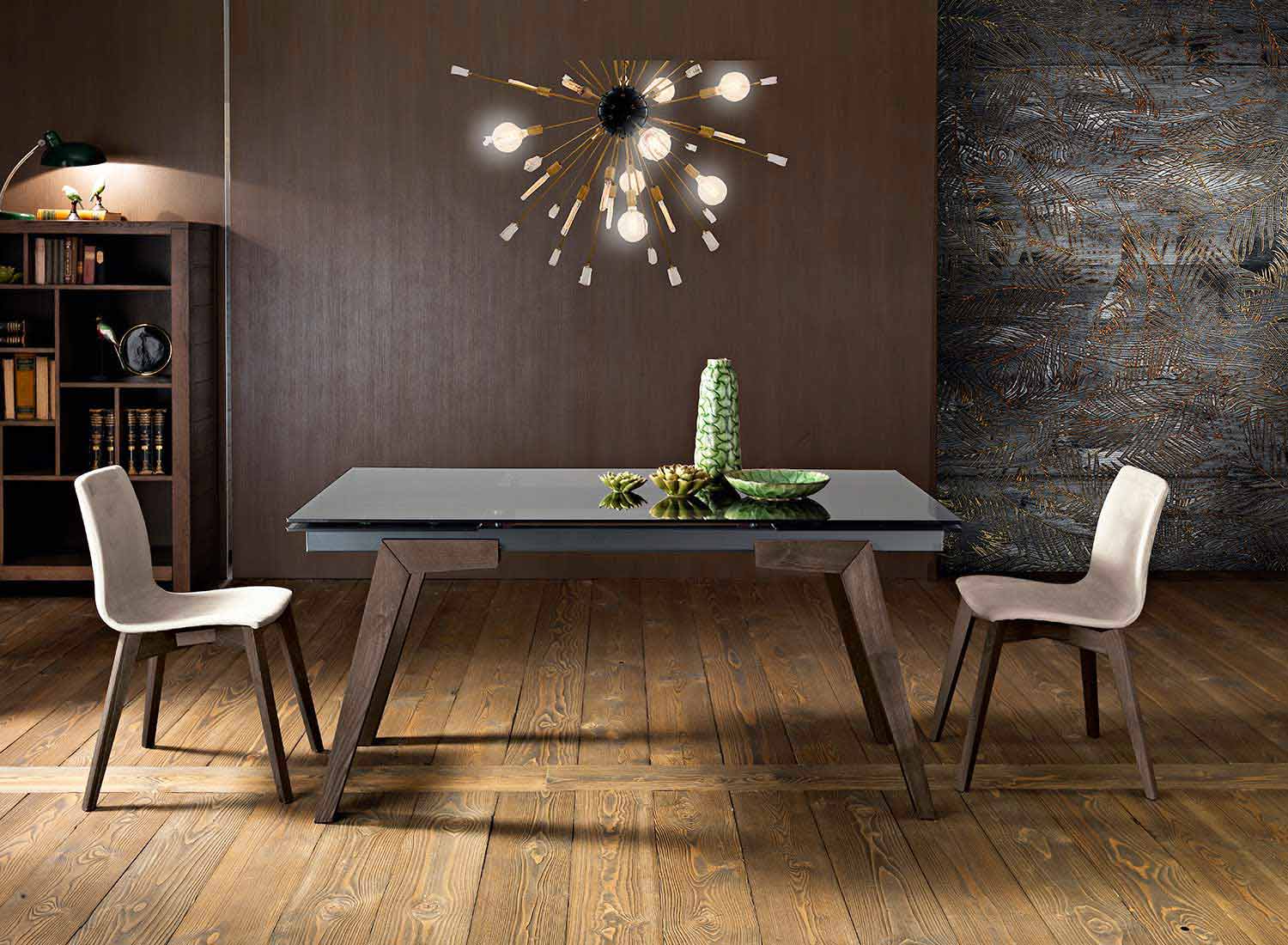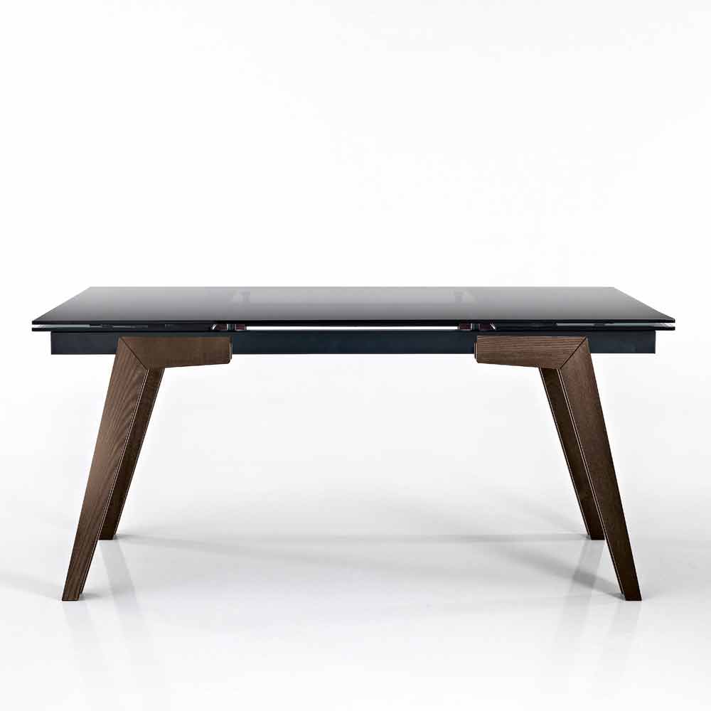 Dimitri es una elegante mesa extensible realizada en Italia con una superficie de vidrio templado con humo (grosor de 10 mm) y una superficie de madera maciza de roble disponible en dos acabados diferentes:
