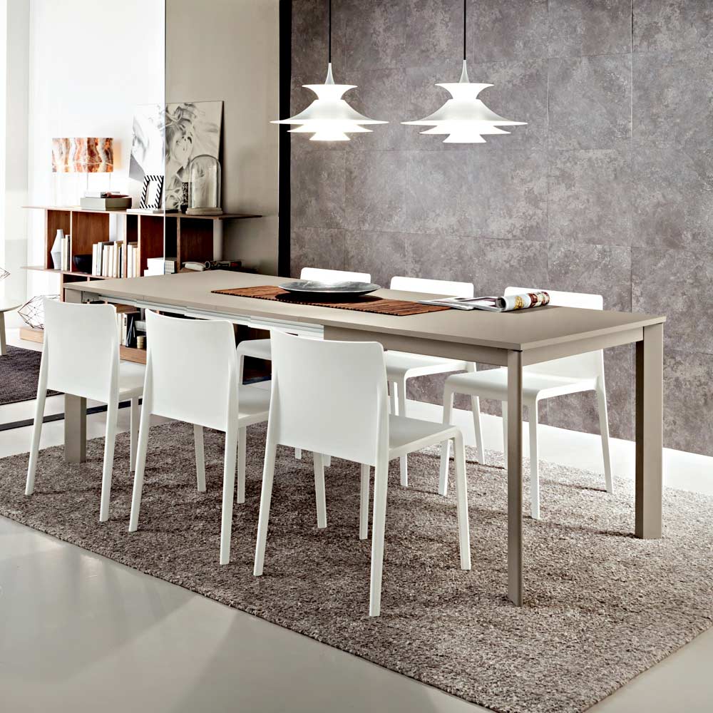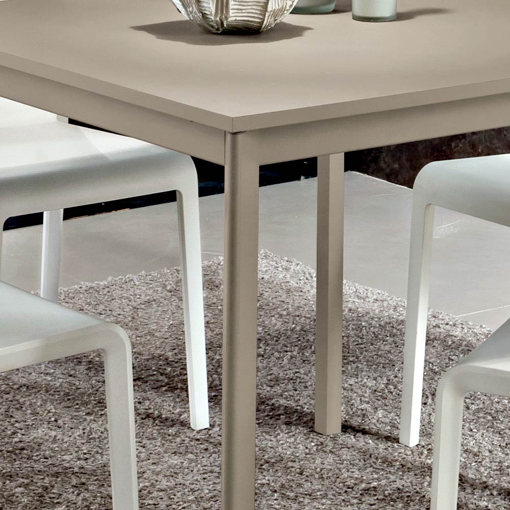 base de aluminio lacado con polvos epoxi a juego con la tapa. Una solución moderna que basa su idea en el concepto de funcionalidad para ofrecer una mesa grande incluso a aquellos que disponen de pequeños espacios pero no quieren renunciar a acoger a amigos y familiares para pasar maravillosos momentos en compañía.