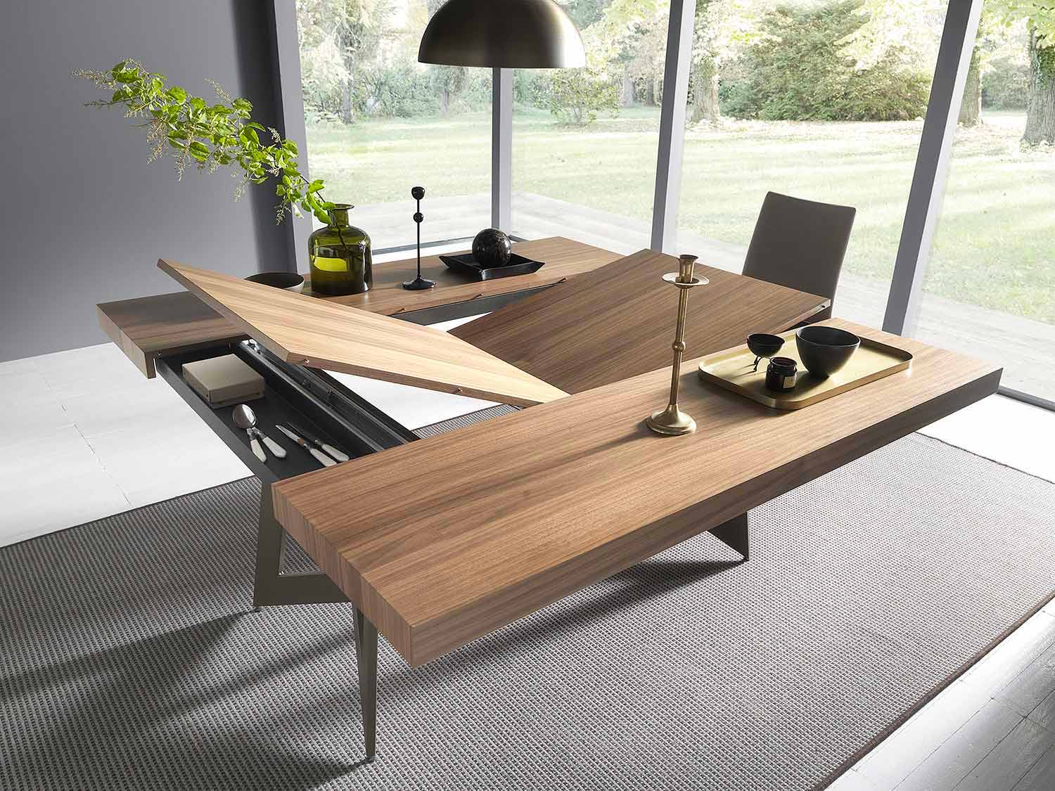 Su característica peculiar consiste en la forma en que se expande de una mesa rectangular a una cuadrada para acomodar de 4 a 8 personas.