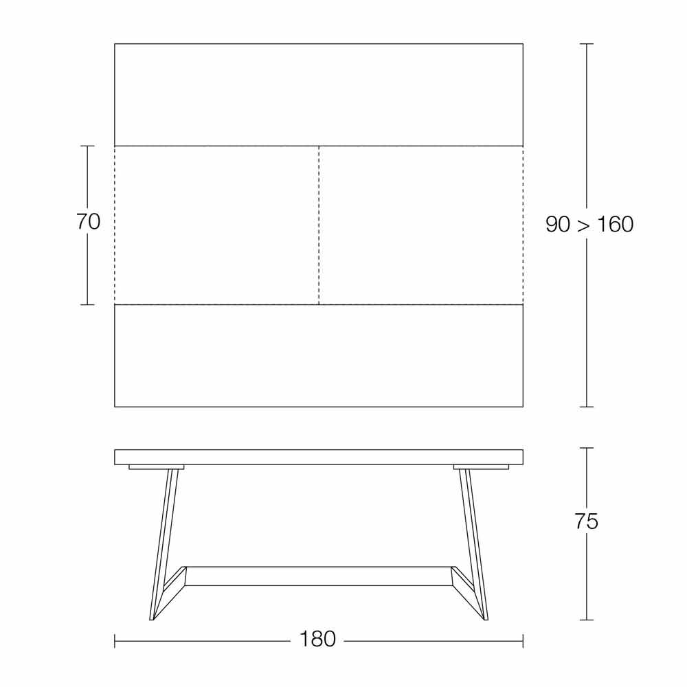 - Ancho 180 x profundidad 90 (160) x altura 75 cm