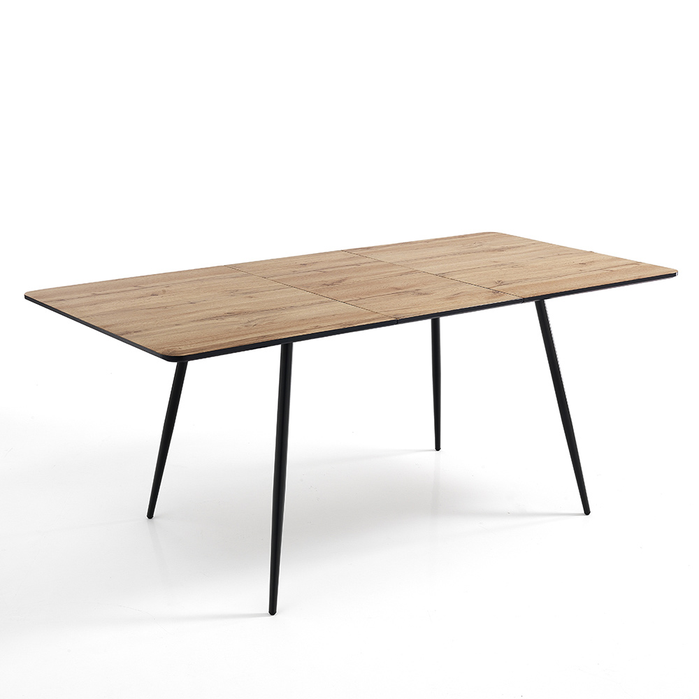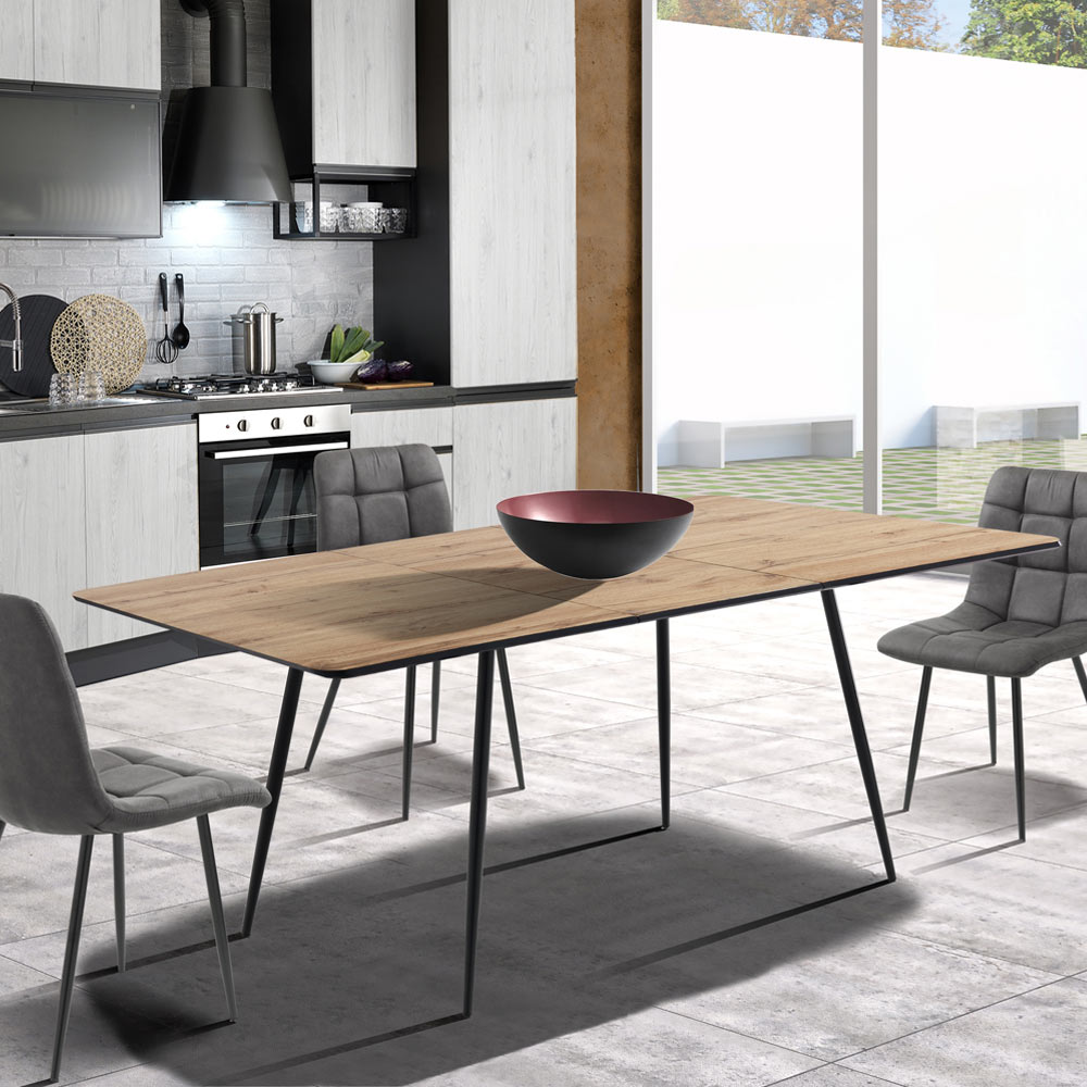 Mesa de comedor extensible hasta 160 cm con tapa de MDF revestida en melamina roble crudo con borde negro mate y patas de metal pintado negro mate . Estiramiento colocado debajo de la parte superior. Gracias a la posibilidad de ampliarse, puede albergar a un mayor número de amigos y familiares para pasar agradables veladas en compañía.