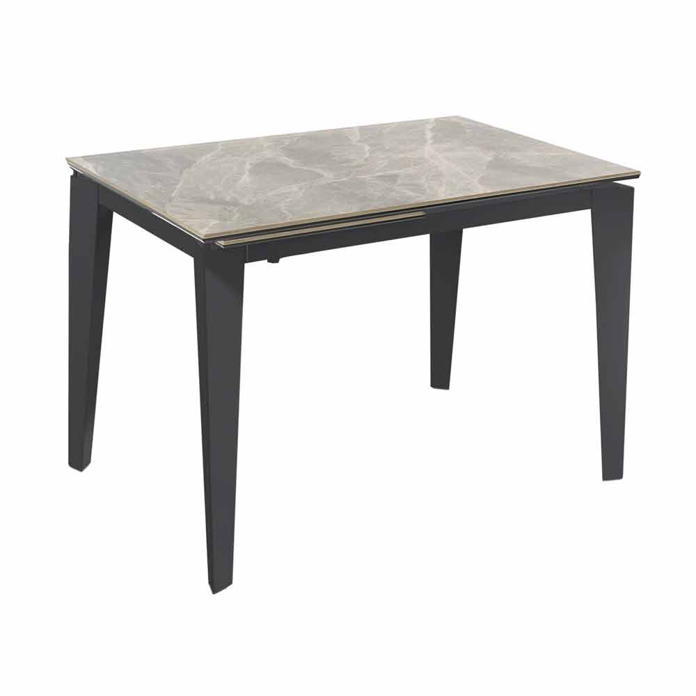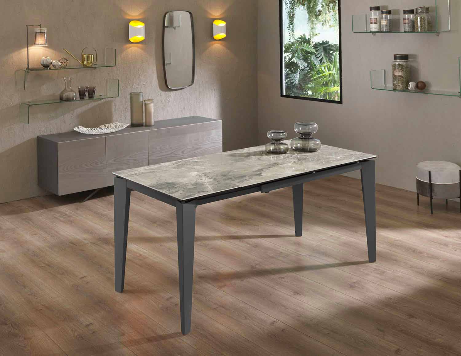 Syrta es una mesa de comedor rectangular que se caracteriza por la posibilidad de extenderse hasta 170 cm para obtener, cuando sea necesario, más espacio en la mesa y en consecuencia mayor comodidad, ideal para albergar amigos y familiares sin sacrificar la comodidad. La mesa está realizada con una estructura de metal pintado y tapa de cerámica sobre vidrio templado color antracita que hace que la mesa sea elegante y resistente al mismo tiempo y también se completa con extensiones internas, también de cerámica sobre vidrio blanco.
