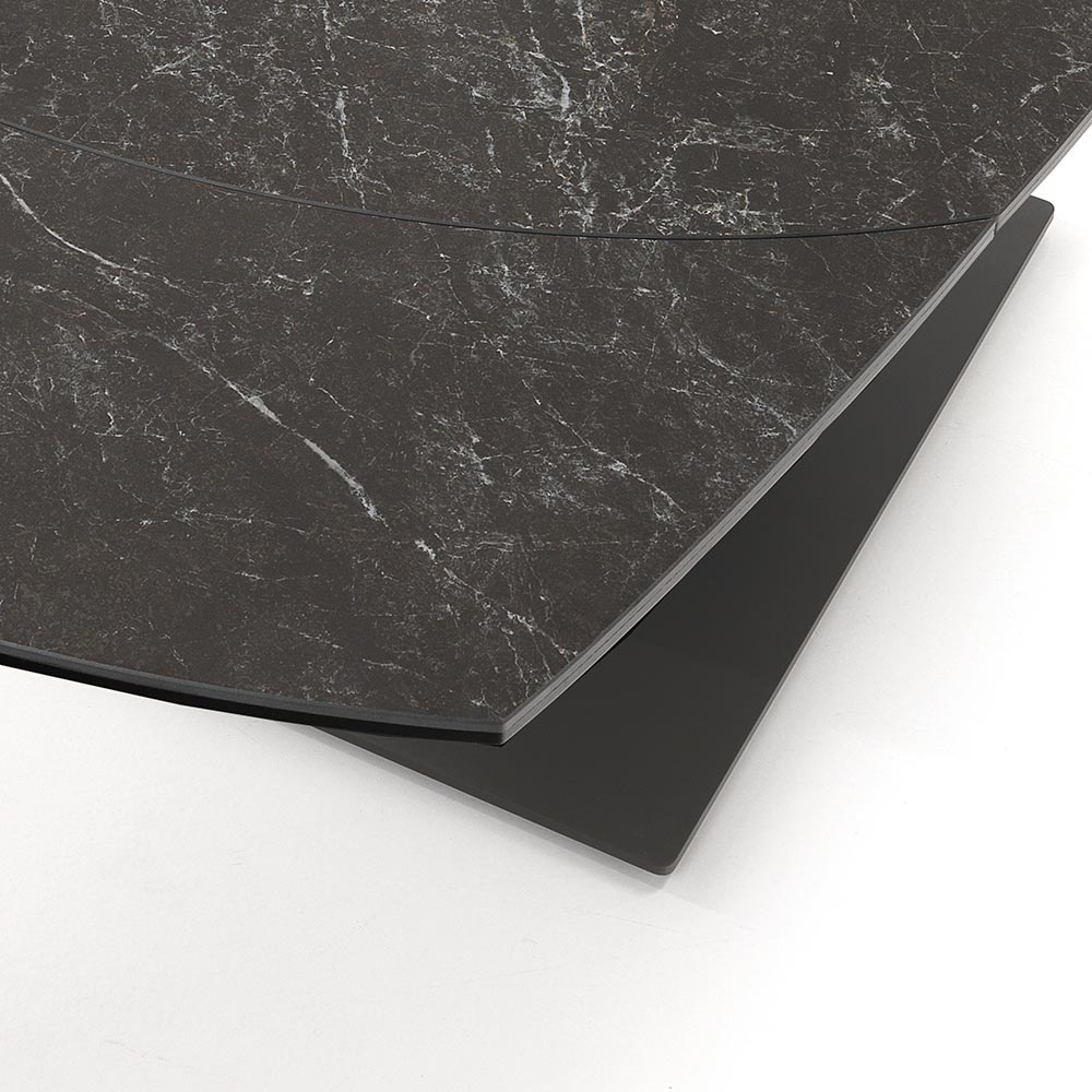 Mesa de comedor con estructura en acero pintado gris mate y tapa extensible fabricada en cerámica con acabado mármol mate (espesor 12mm). Gracias a una extensión de 60 cm colocada debajo de la tapa y apertura con un práctico mecanismo giratorio , la mesa puede alcanzar una longitud máxima de 180 cm lo que le permite acomodar a un mayor número de invitados para maravillosos almuerzos y cenas con amigos. La perfecta combinación de la elegancia de la cerámica y el imponente detalle de la base de acero crea un mueble con una personalidad única y un fuerte impacto visual, ideal para conquistar el centro de atención en comedores o cocinas modernas.