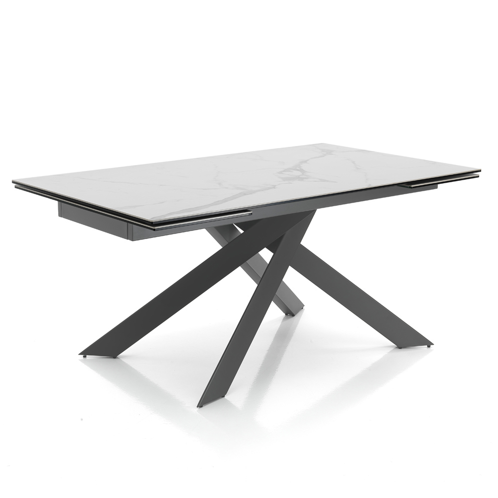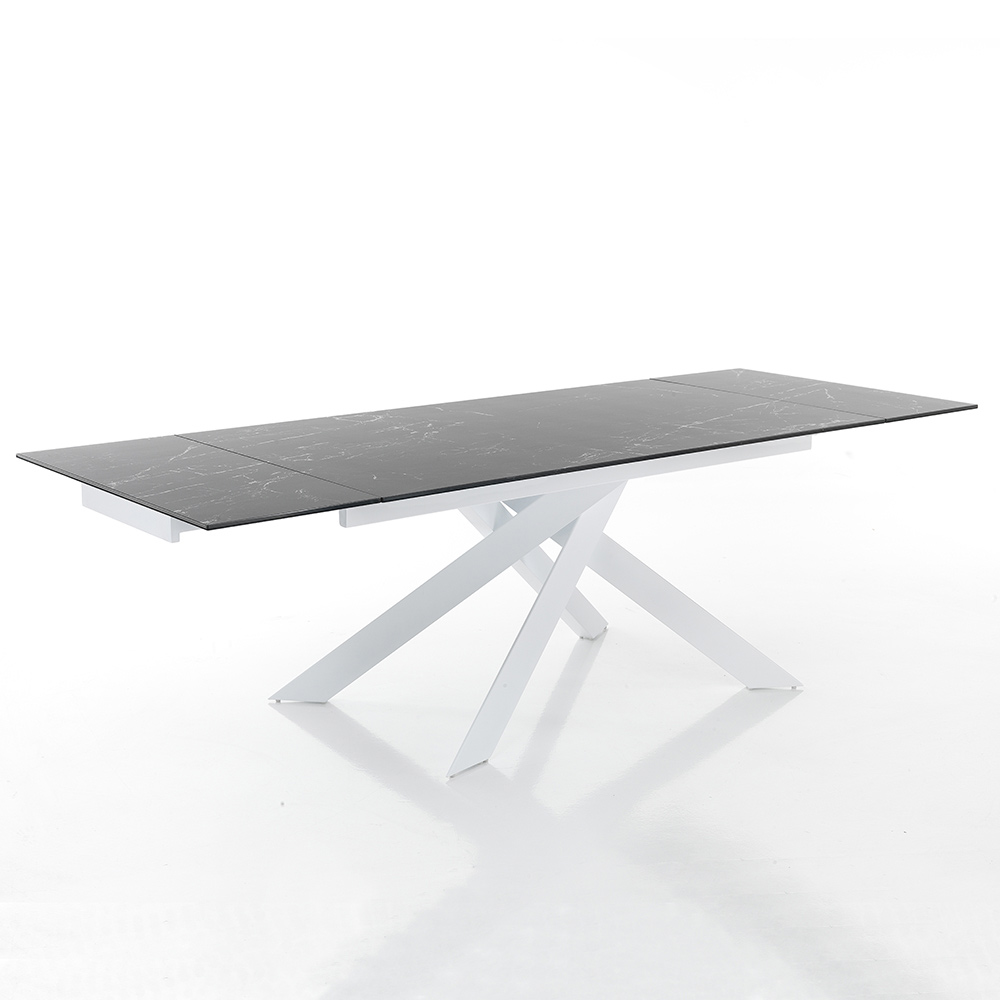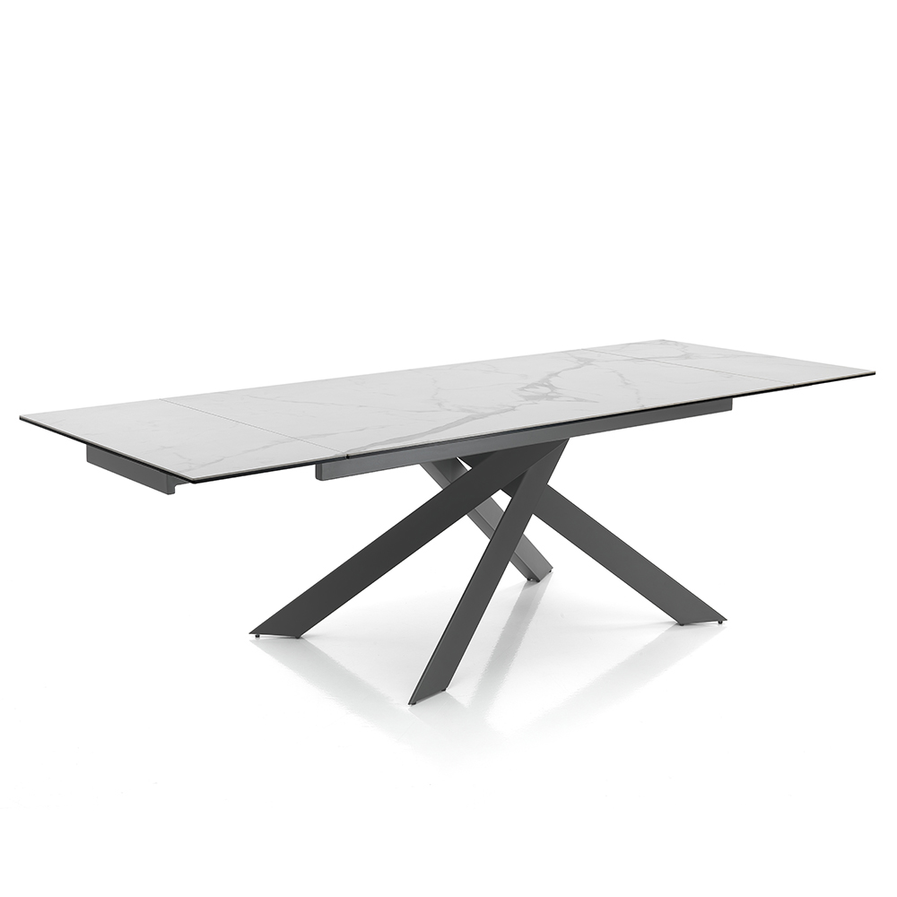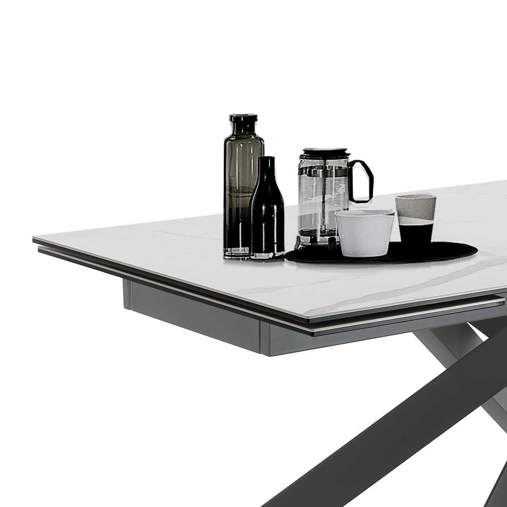 Mesa de comedor extensible en cerámica con efecto mármol y acero.