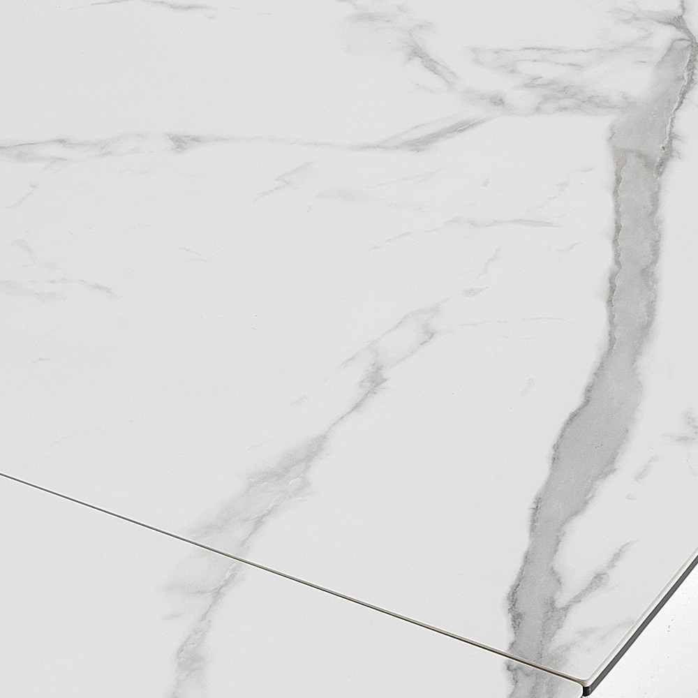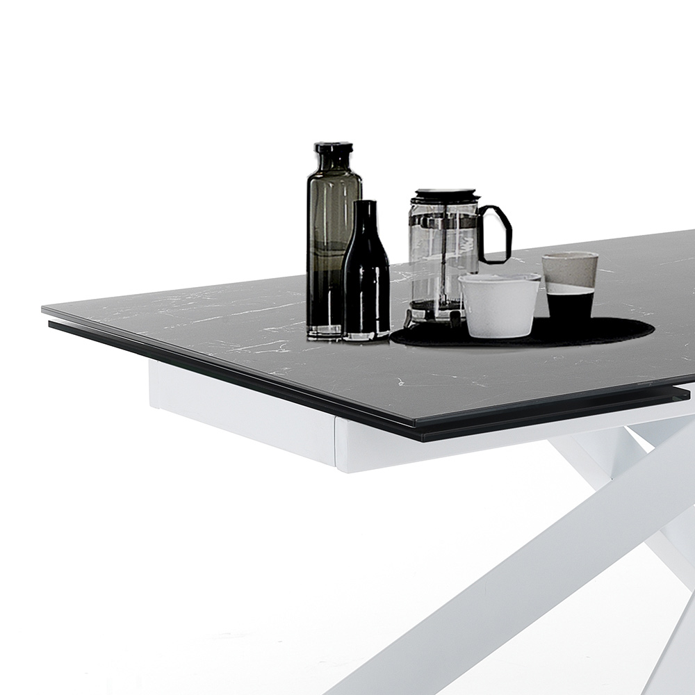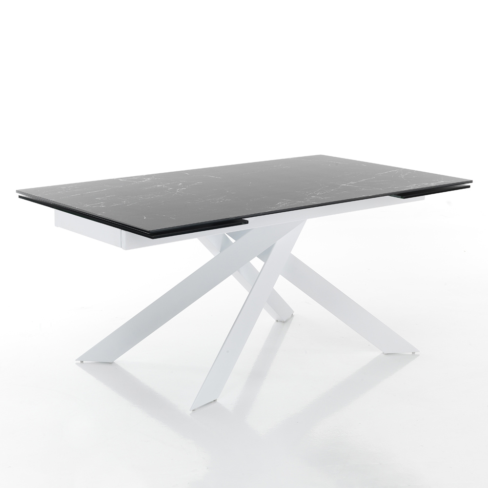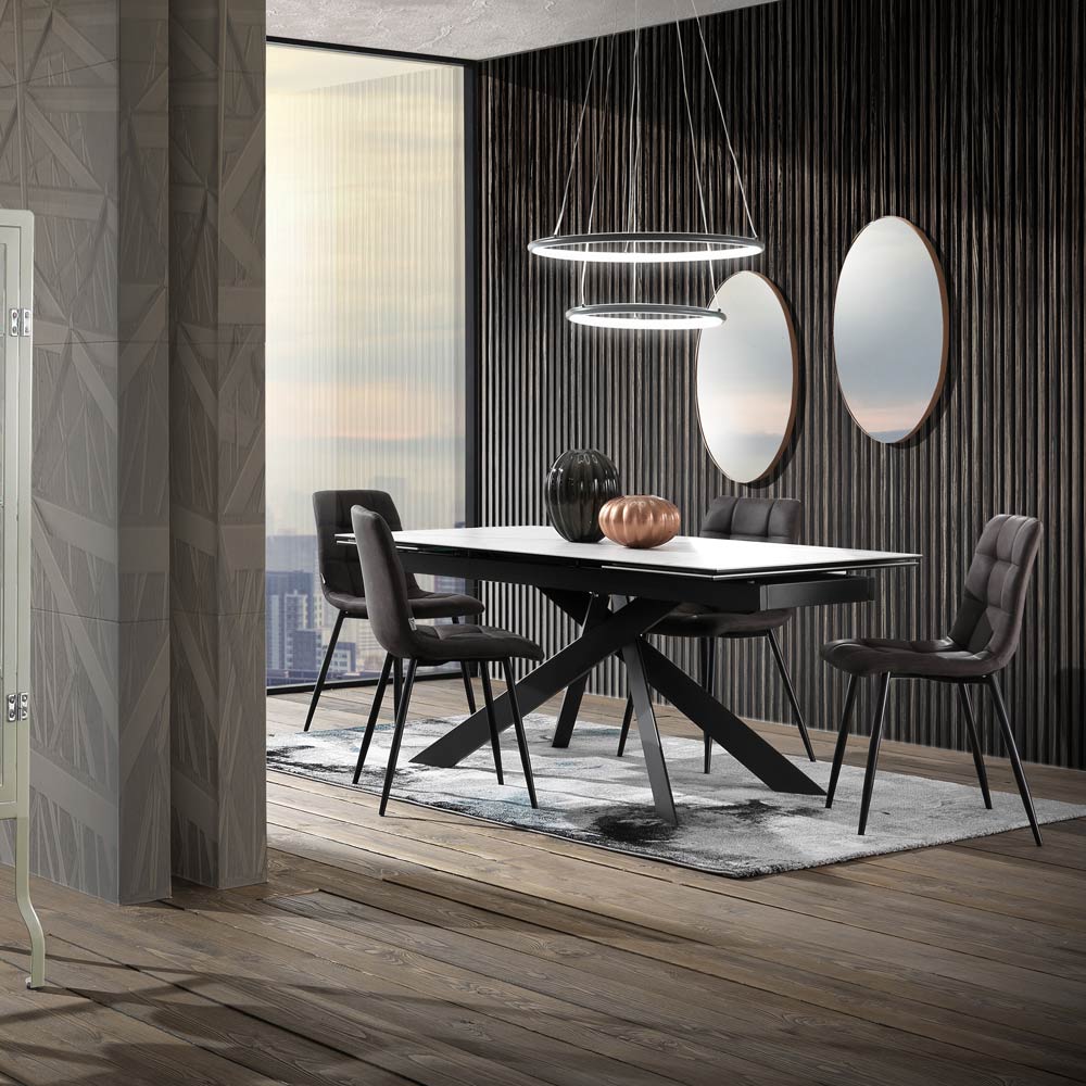 Mesa de comedor extensible en cerámica con efecto mármol y acero.