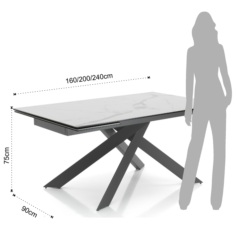 Mesa de comedor con tapa extensible fabricada en cerámica con acabado mármol mate y estructura de acero pintado . Gracias a las dos extensiones de 40 cm cada una colocadas debajo del tablero, la mesa puede alcanzar una longitud máxima de 240 cm lo que le permite acomodar a un mayor número de invitados para maravillosos almuerzos y cenas con amigos. La perfecta combinación de la elegancia de la cerámica y el imponente detalle de la base de acero crea un mueble con una personalidad única y un fuerte impacto visual, ideal para conquistar el centro de atención en comedores o cocinas modernas.