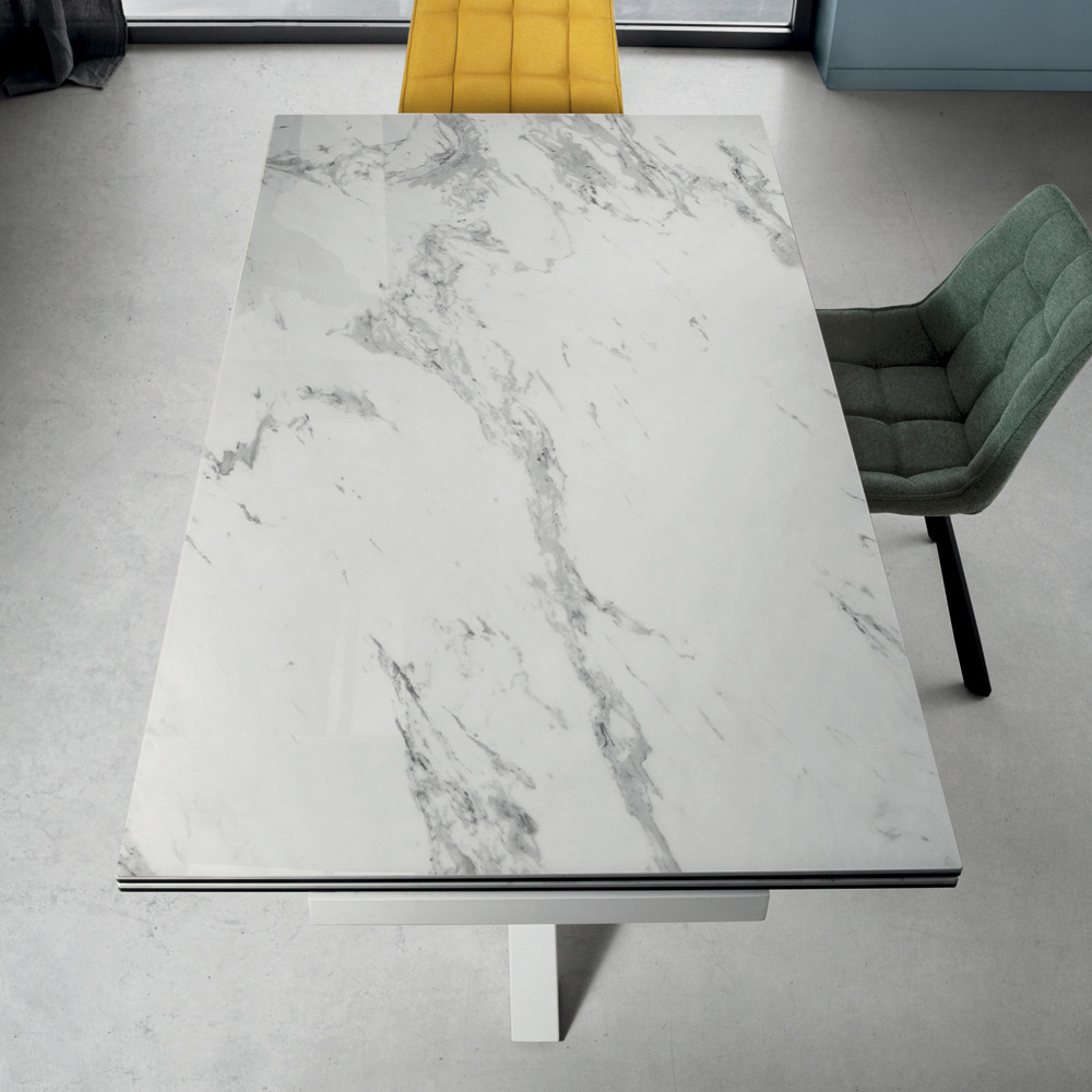 Mesa de comedor extensible con tapa de gres porcelánico efecto mármol y base de metal pintado de líneas sencillas y modernas, capaz de dar carácter a tu ambiente. Equipado con 2 extensiones laterales de 40 cm y un mecanismo de rotación que permite extender el tablero de forma rápida y sencilla para un resultado funcional y especialmente original .