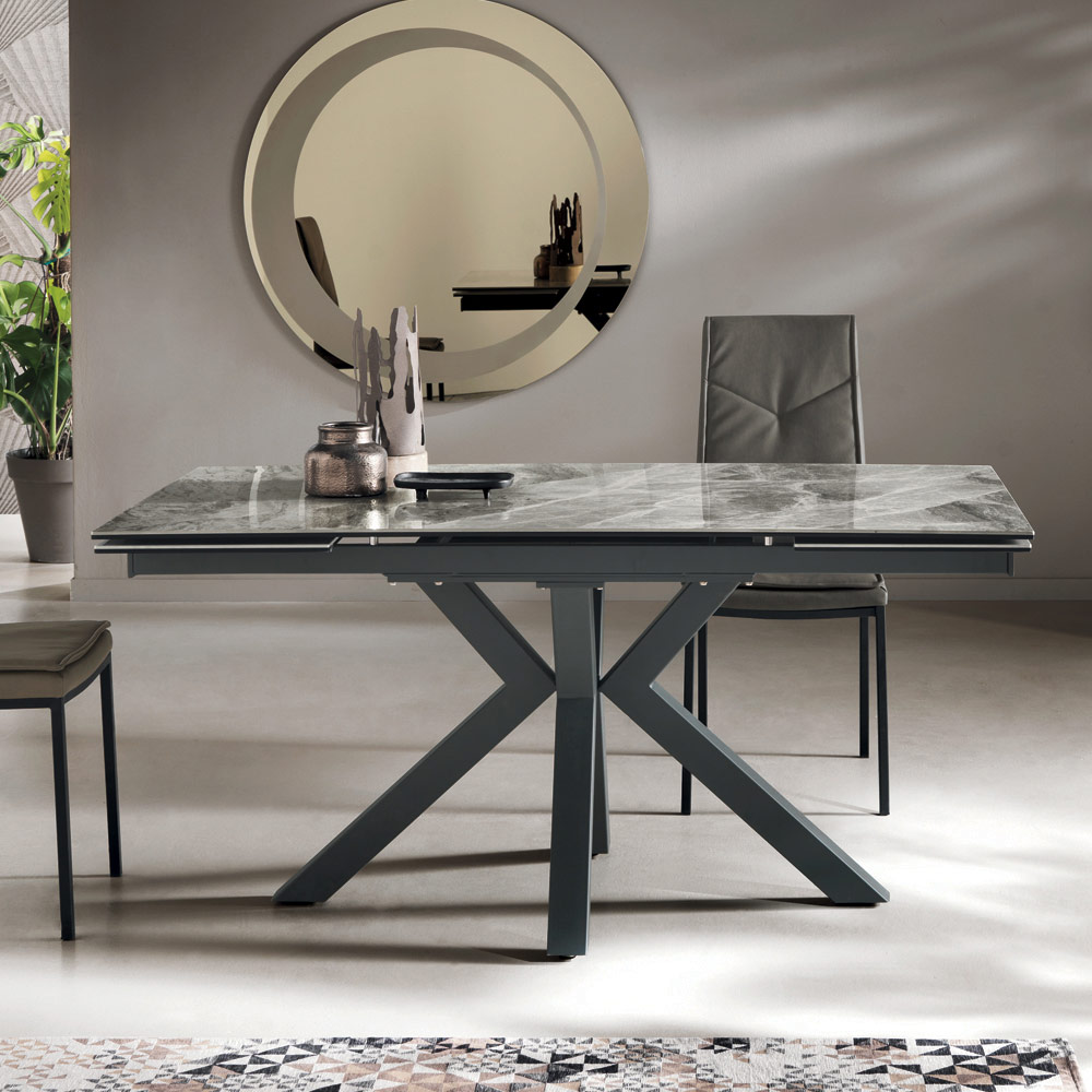 Su estética se ve enriquecida y singularizada por la particular forma cruzada de la base que aporta solidez y robustez al producto además de dar un toque de personalidad exclusiva a su diseño final. La elegante tapa de efecto mármol le da a la mesa un estilo imponente capaz de conquistar el papel de protagonista en la habitación gracias también a sus grandes dimensiones. El resultado es un mueble particularmente moderno, ideal para quienes buscan calidad , elegancia y funcionalidad en un solo producto.