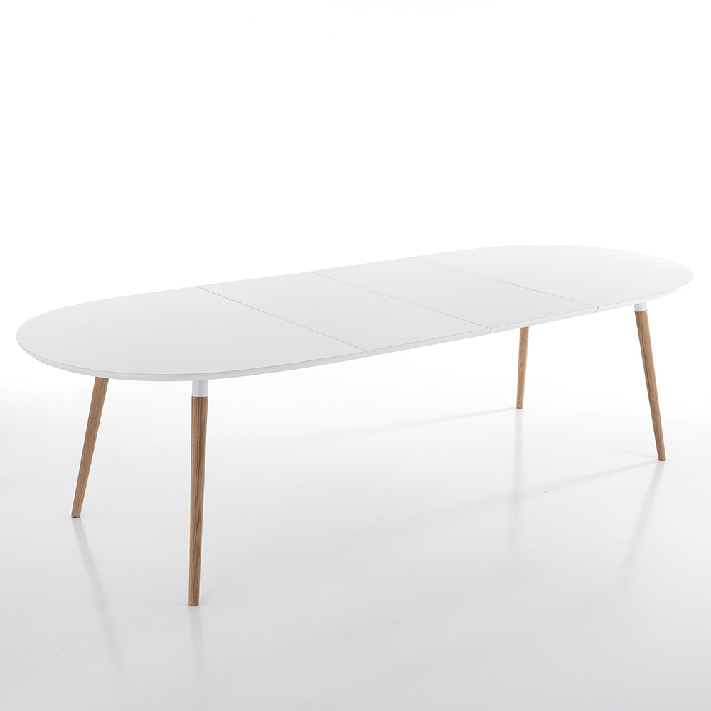 Mesa de comedor con tapa extensible fabricada en mdf lacado en blanco mate y patas en madera maciza con acabado roble . Un producto con un diseño simple y limpio, ideal para quienes aman un estilo de mobiliario esencial y versátil capaz de completar el estilo de su comedor o cocina con gusto y personalidad. Su punto fuerte está representado por el tablero extensible gracias a dos extensiones de 50 cm cada una que permiten que la mesa alcance una longitud de 220 o 270 cm.