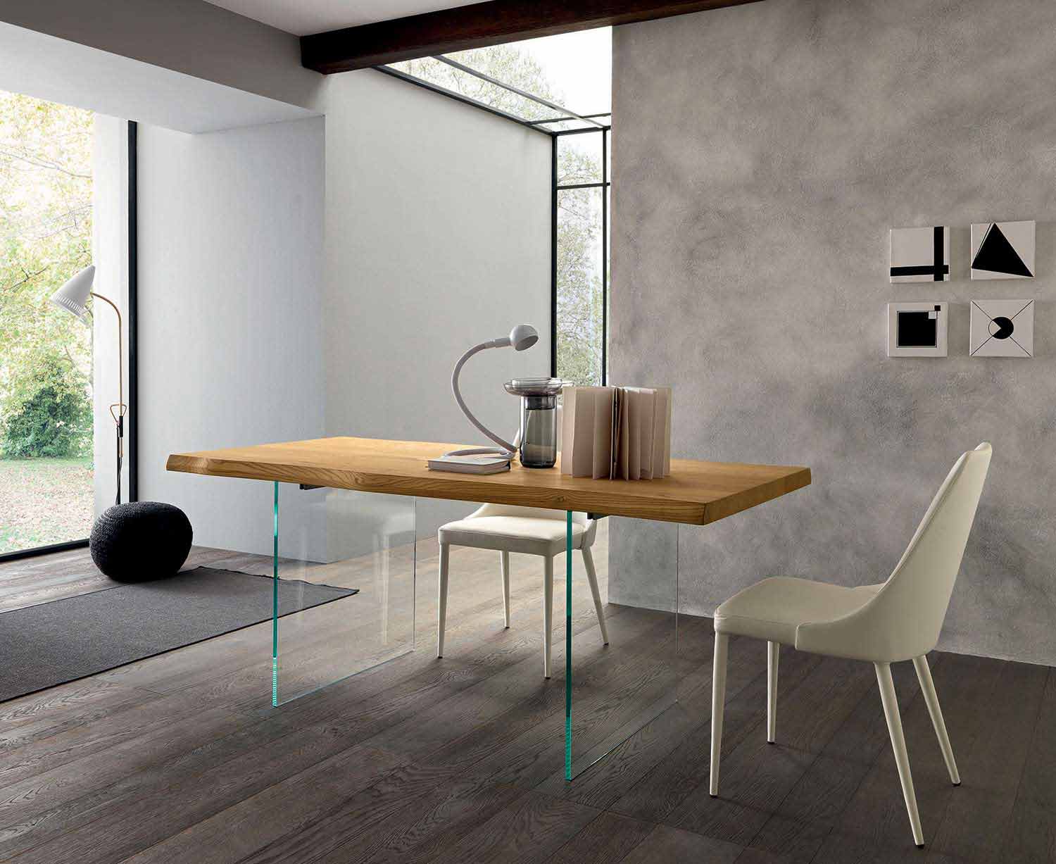 Su peculiaridad consiste en las patas de cristal transparente , que parecen hacer flotar la tapa de madera con una marcada referencia natural y de gran espesor (5 cm).