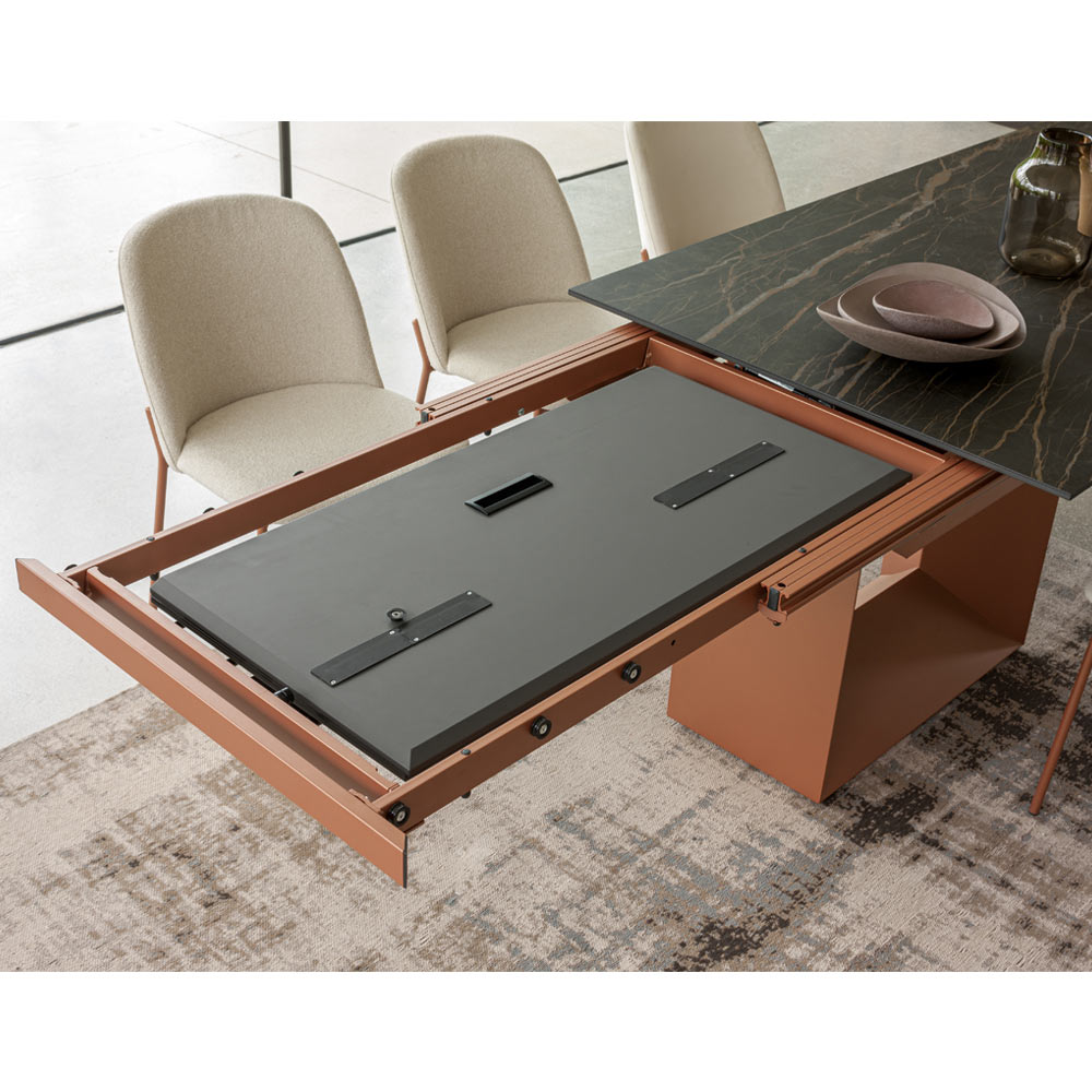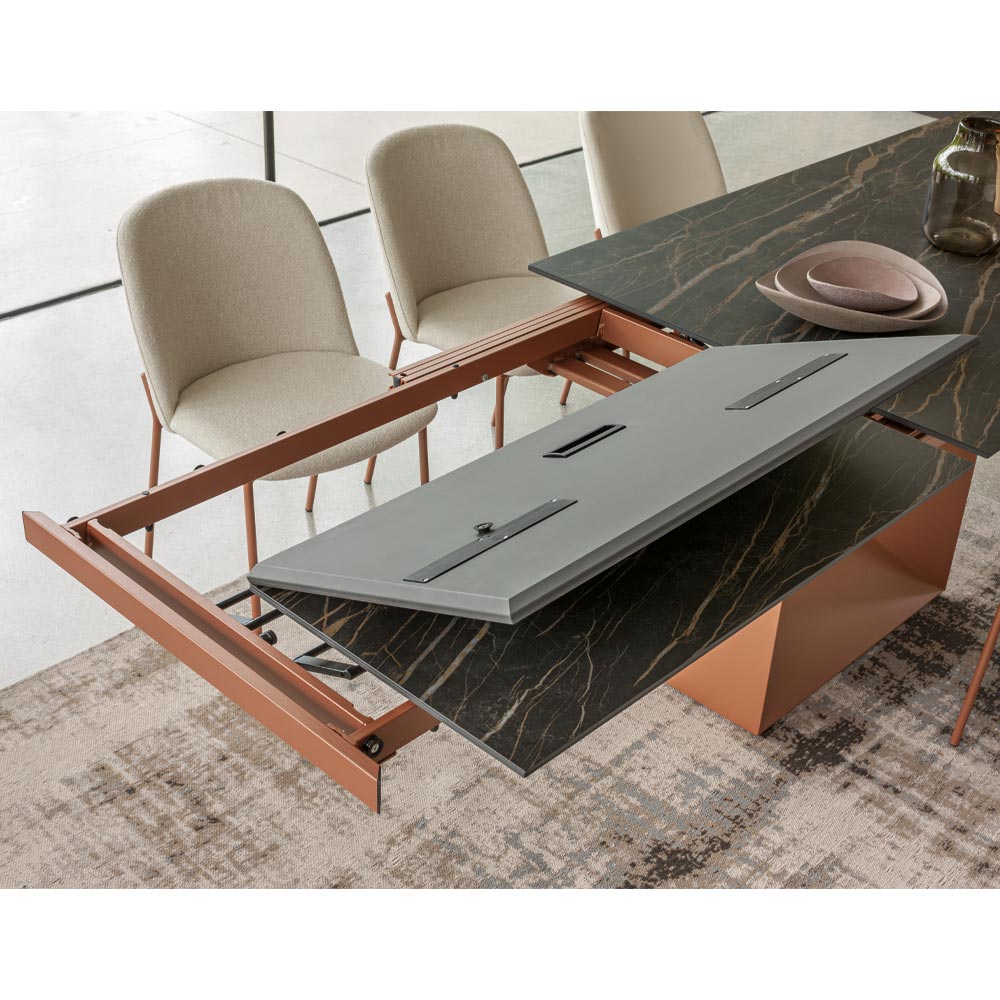 Mesa de salón realizada con tapa de cerámica , base y estructura de metal extensible, mecanismo telescópico y apertura abatible sincronizada con extensión interna de cerámica con continuidad de veta , íntegramente Made in Italy. Este artículo es el emblema de funcionalidad y estilo. Con estructura de metal extensible y tapa de cerámica, esta mesa de comedor está diseñada para adaptarse a las necesidades dinámicas de la decoración moderna. El mecanismo telescópico permite extender fácilmente la mesa, ofreciendo más espacio cuando sea necesario. La apertura sincronizada con una extensión de libro interna hace que la operación sea sencilla y rápida. Con su diseño elegante y funcionalidad superior, la mesa es un valioso aliado para cualquier ambiente de comedor contemporáneo.