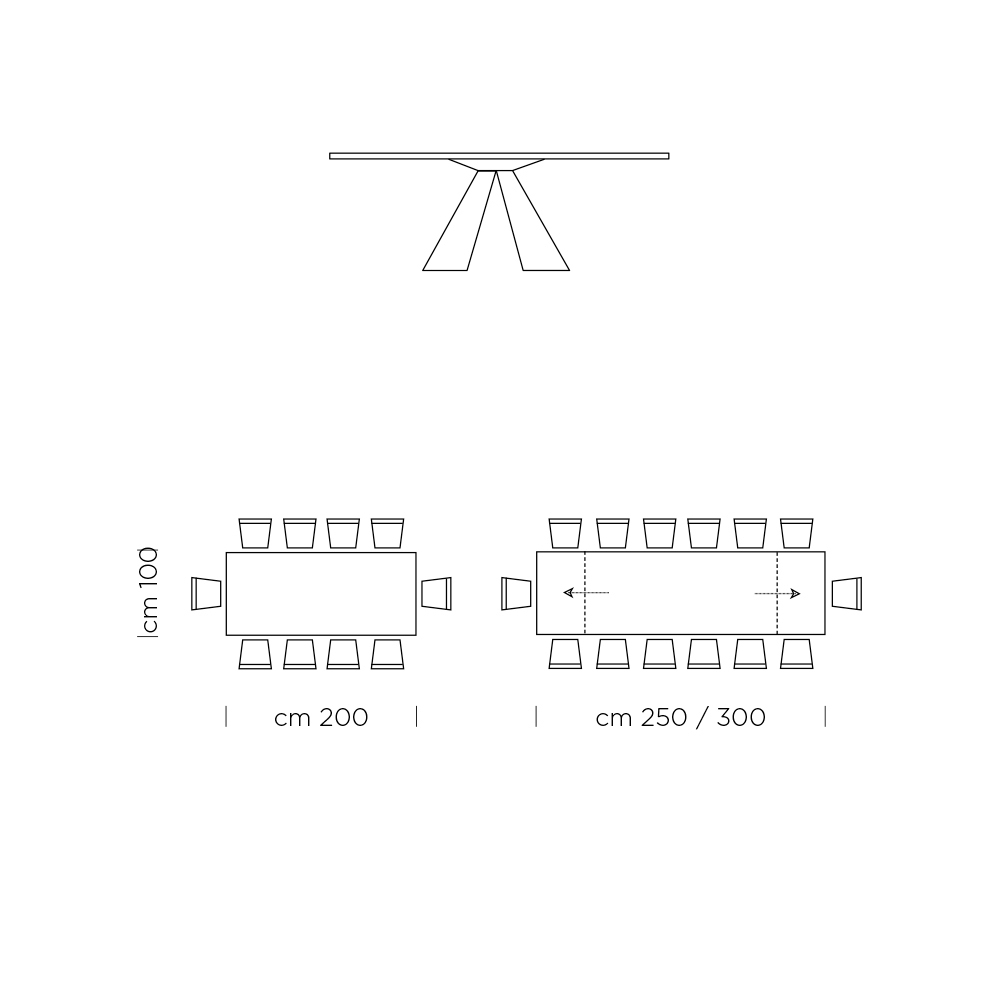 - L 200/300 x P 100 x H 75,5 cm 14 plazas (2 extensiones de 50 cm).