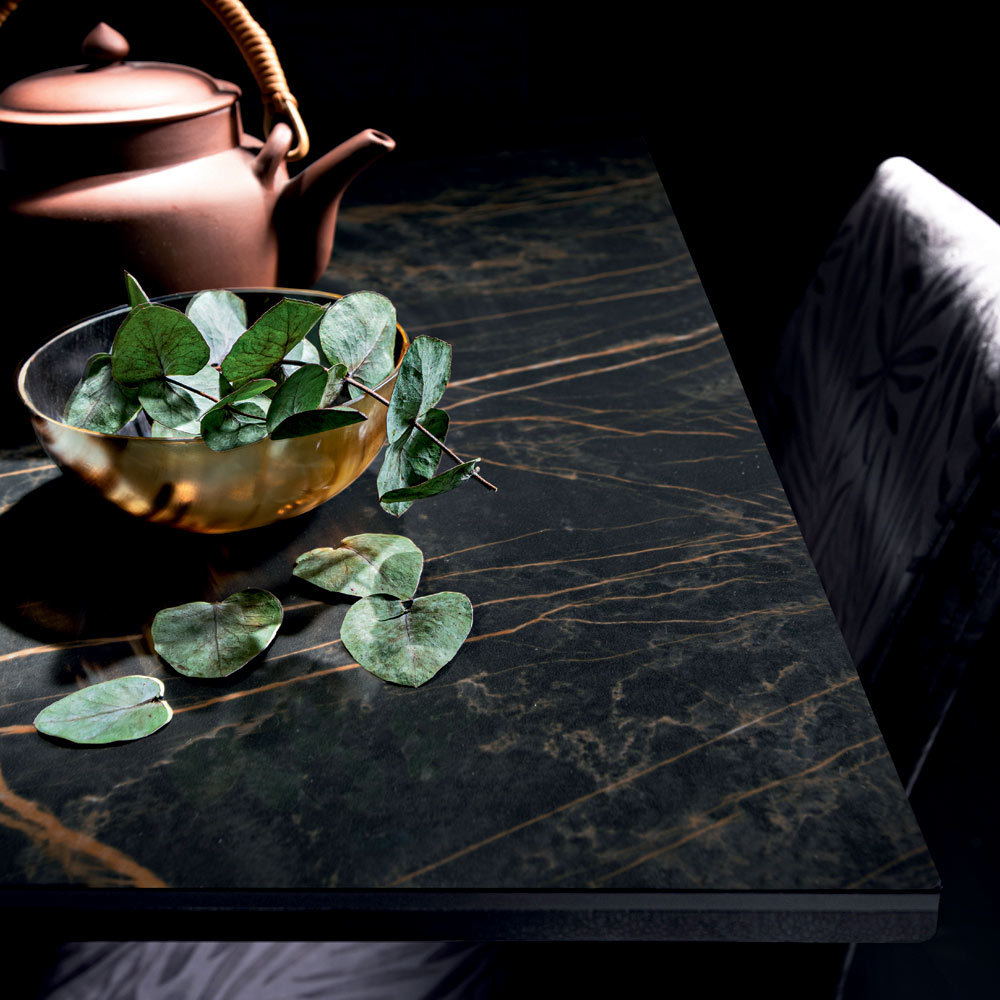 resistente en el tiempo . De hecho, el laminam, además de completar con elegancia el aspecto de la mesa, es un material que presenta numerosas peculiaridades que lo convierten en una opción ideal para aportar al mismo tiempo una