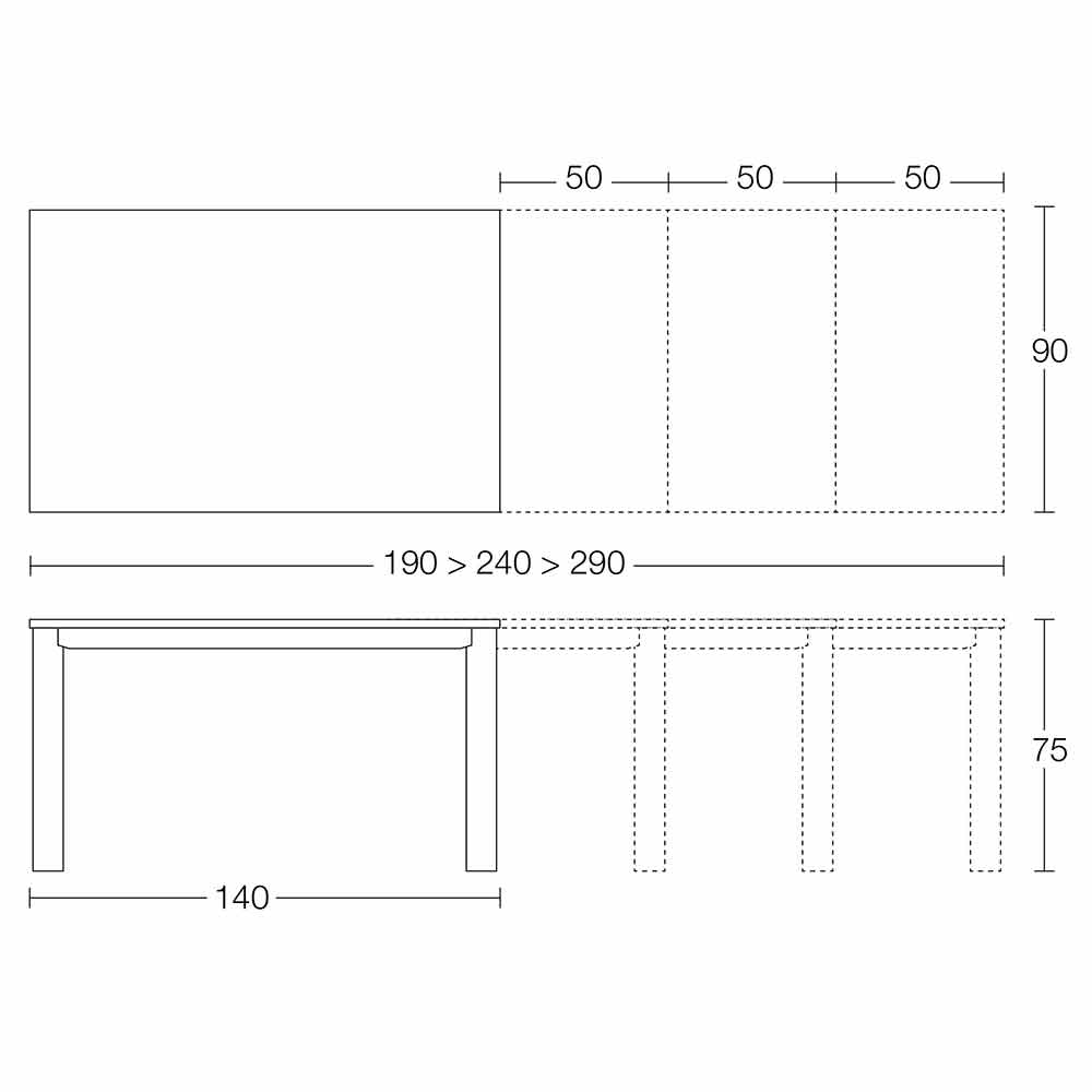 La tapa se puede extender gracias a un mecanismo telescópico con 3 extensiones internas de longitud igual a 50 cm cada una en MDF. Las extensiones no son del mismo color que la parte de arriba.