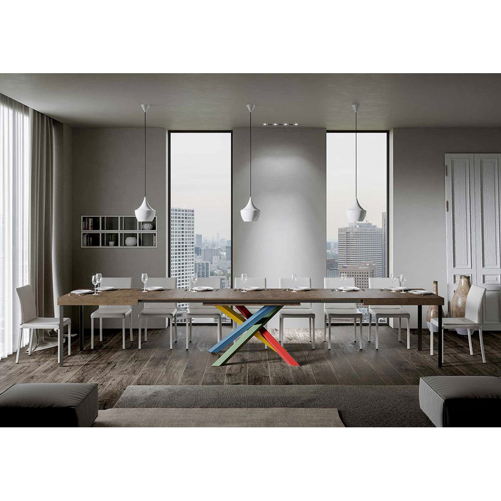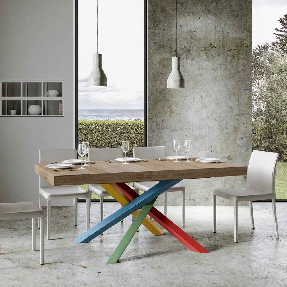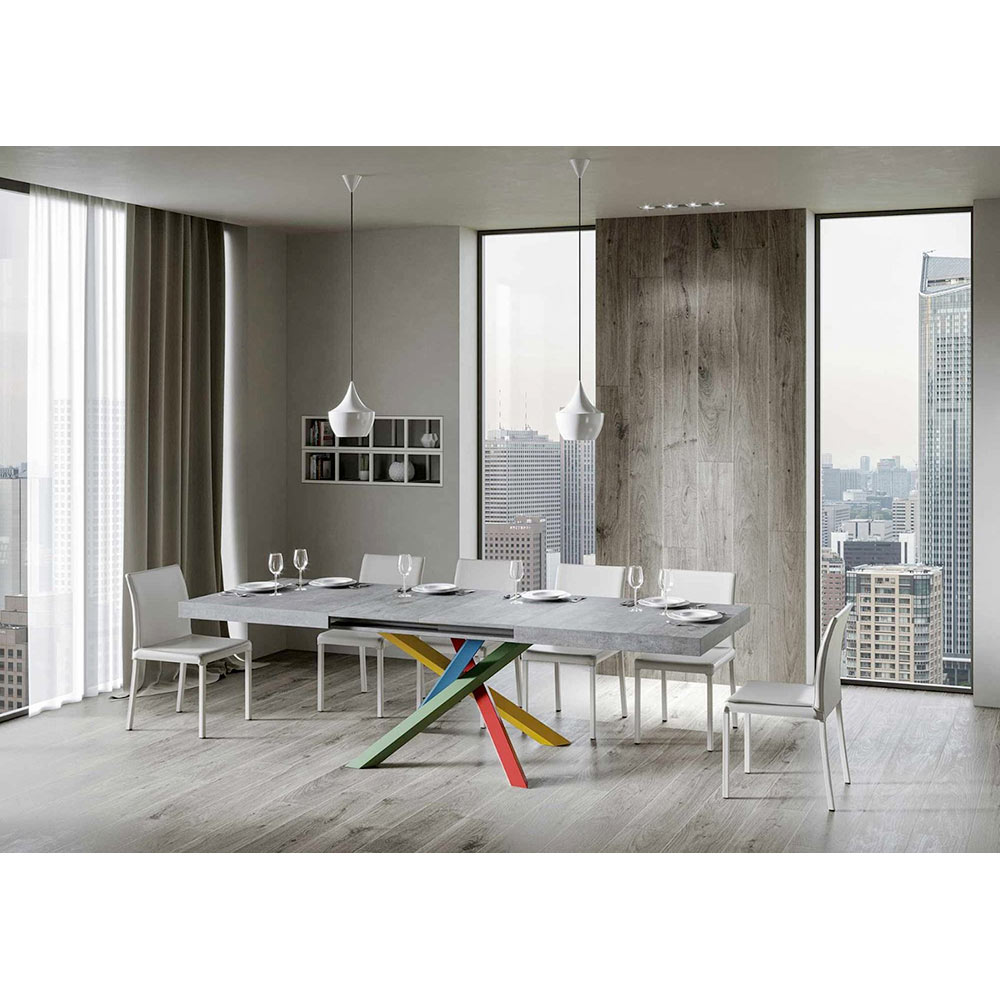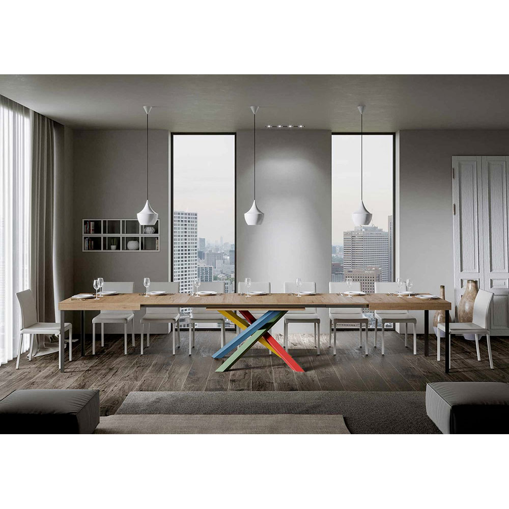 Descubre la mesa extensible, una obra maestra del diseño moderno que destaca por su silueta única y versátil funcionalidad. El sobre de madera realza la luminosidad de los espacios, ofreciendo una superficie lisa y resistente que invita al uso diario. La base de la mesa è un verdadero espectáculo geométrico, con patas cruzadas que se entrelazan en un juego de colores. La combinación propuesta è : Pata 1: Rojo Carmín (RAL 3002). Pata 2: Verde amarillento (RAL 6018). Pierna 3: Azul lejano (RAL 5023). Pierna 4: Amarillo Señal (RAL 1003). Los colores RAL son opacos. Esta combinación no sólo añade un toque de vitalidad al diseño, sino que también garantiza estabilidad y resistencia. El mecanismo de extensión de la mesa es tan simple como ingenioso, lo que permite que este elegante mueble se transforme de una práctica mesa para cuatro a una acogedora zona para celebrar cenas y reuniones más grandes.