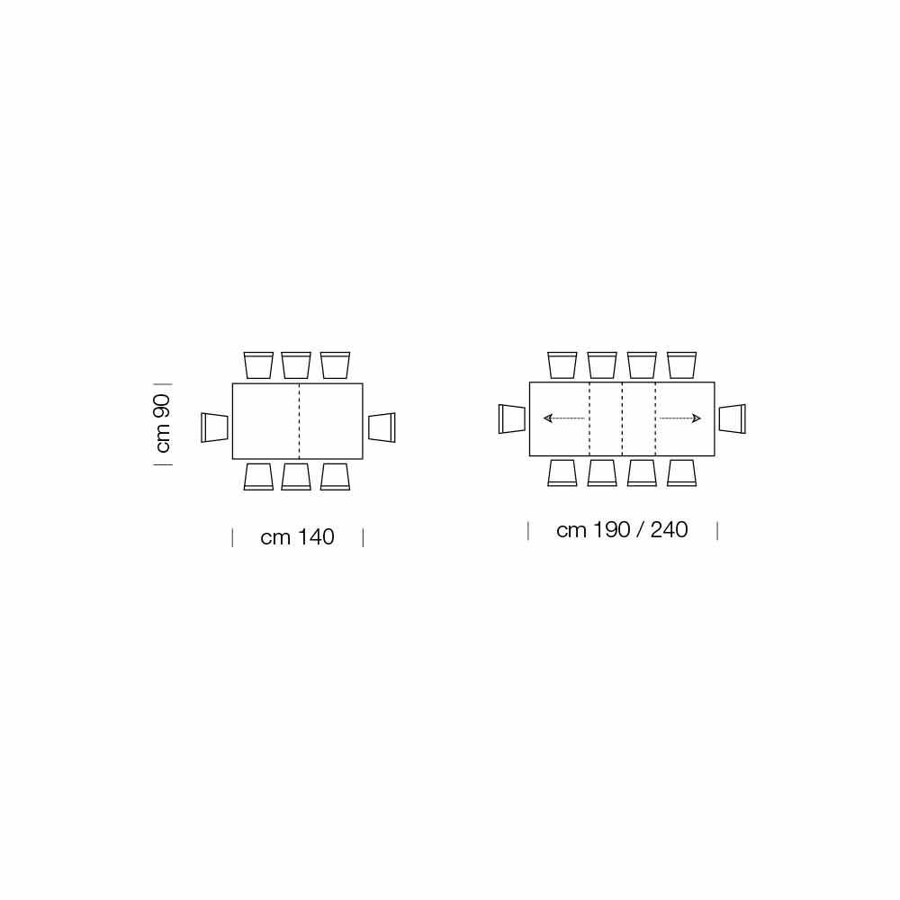 L 140 (240) x P 90 x H 75,3 cm 10 plazas extensible con dos extensiones internas de 50 cm cada una;