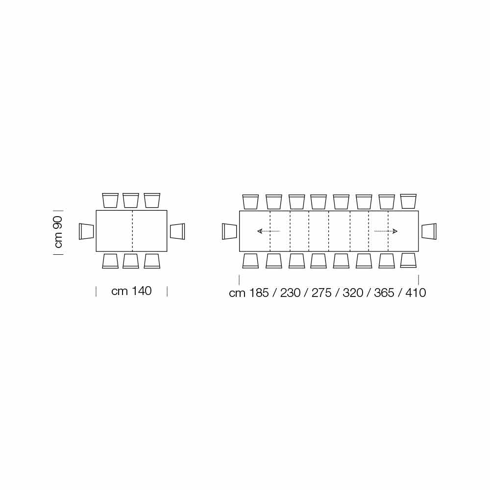 L 140 (410) x P 90 x H 75,3 cm 18 asientos extensibles con tres extensiones internas de 45 cm cada una y tres extensiones externas de 45 cm cada una;