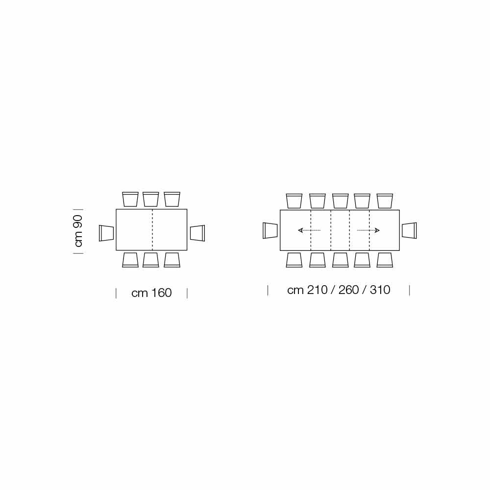 L 160 (310) x P 90 x H 75,3 cm 12 plazas extensible con tres extensiones internas de 50 cm cada una;