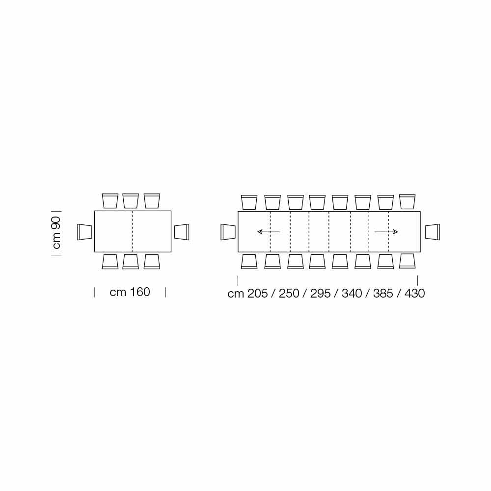 L 160 (430) x P 90 x H 75,3 cm 18 asientos extensibles con tres extensiones internas de 45 cm cada una y tres extensiones externas de 45 cm cada una;
