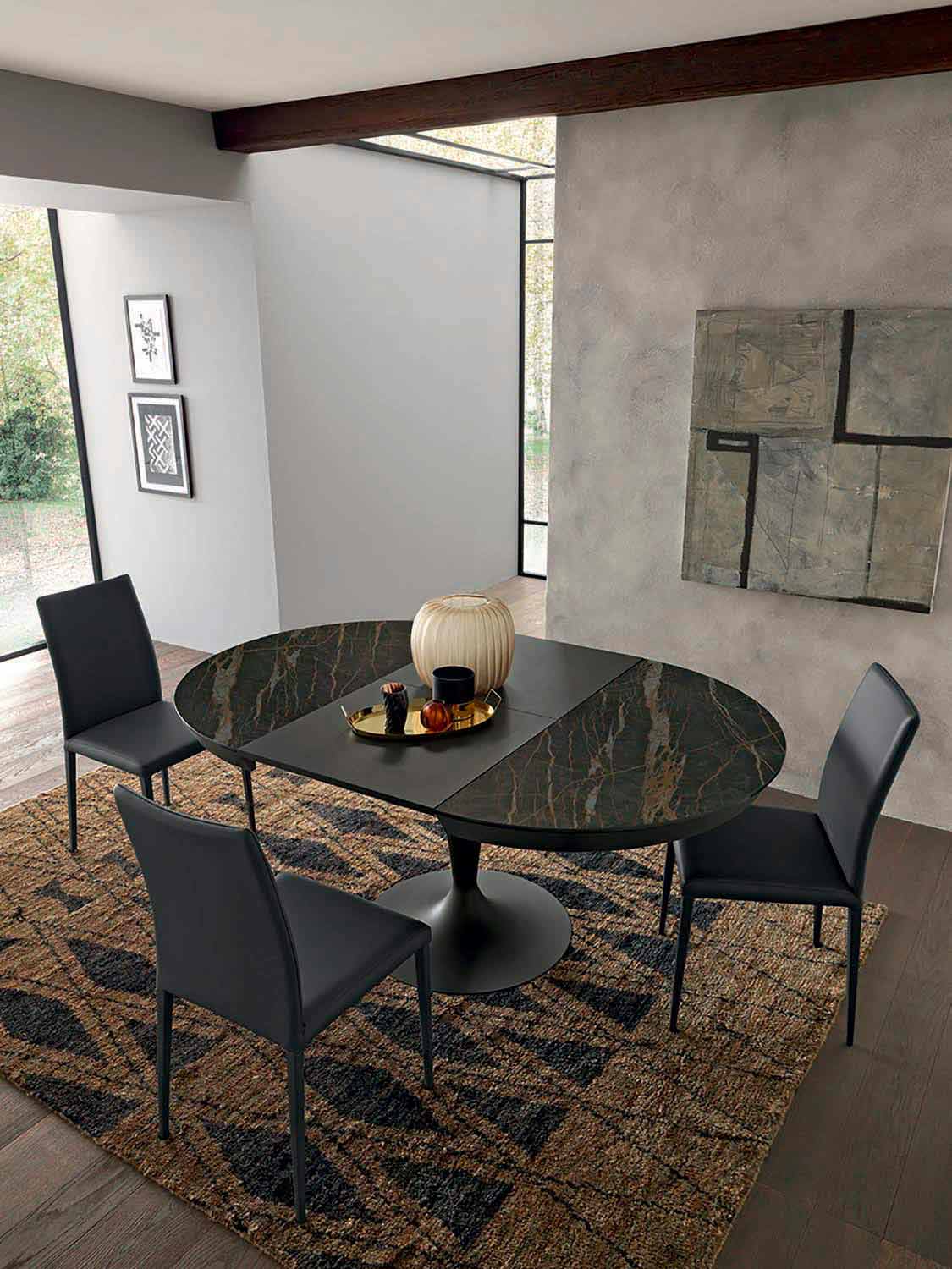Mesa de comedor extensible de diseño con tapa redonda de cerámica laminada y base de metal Made in Italy.