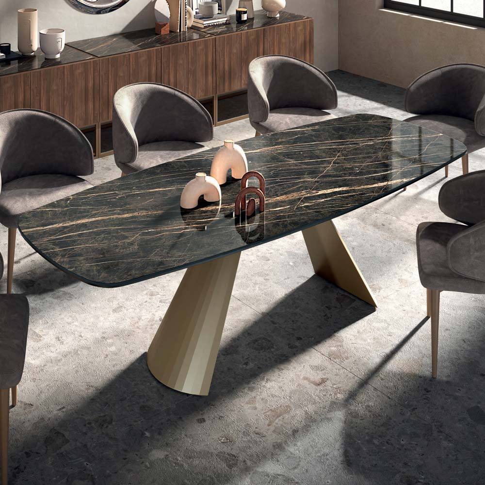 Mesa de salón fija en forma de barril, con tapa de cerámica , biselado a 45° , base de acero lacado champagne y pies regulables. La elección de materiales de primera calidad y la atención en la creación de cada detalle crean un producto de excelente calidad Made in Italy . Gracias a la forma de la base y a los acabados disponibles, esta mesa es protagonista de cualquier ambiente contract diario , convirtiéndose en una idea perfecta para todos aquellos que quieran darle a la estancia un toque elegante, suntuoso y único.
