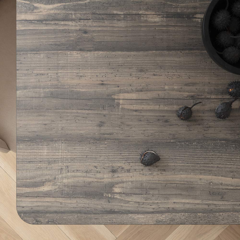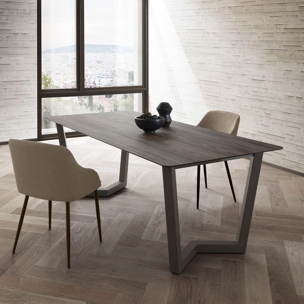 Mesa de comedor rectangular fabricada en Italia compuesta por patas de metal pintado con polvos epoxi acabado arena y sobre de hpl estratificado de 10 mm de espesor. Un mueble caracterizado por una estructura elegante y escultórica que nace de la combinación de materiales de diferente naturaleza junto con la pasión por la fabricación.