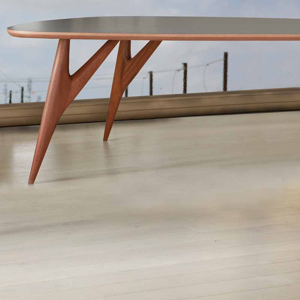 Mesa de comedor moderna y original totalmente hecha a mano en Italia con tablero laminado HPL y estructura de madera maciza de caoba.