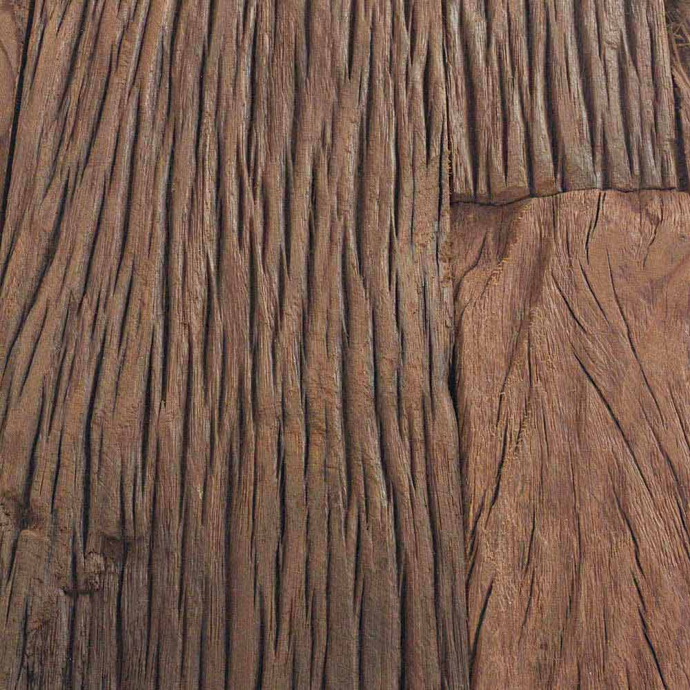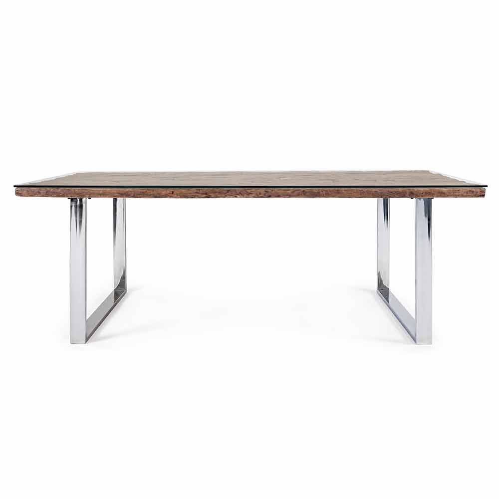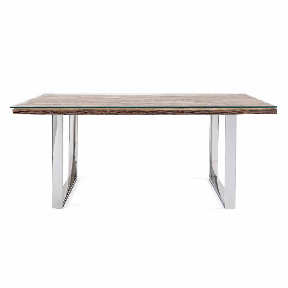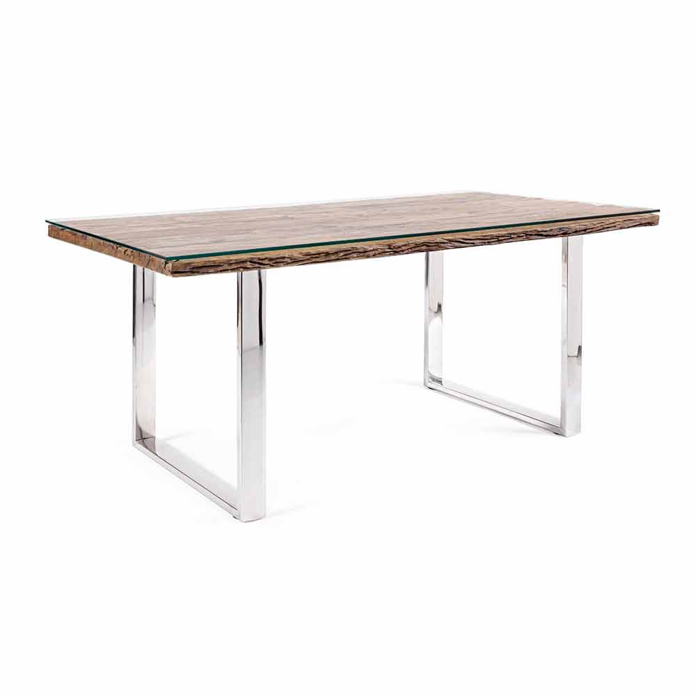Tapa de madera reciclada . Acabado natural. Vidrio templado . Patas en acero inoxidable .