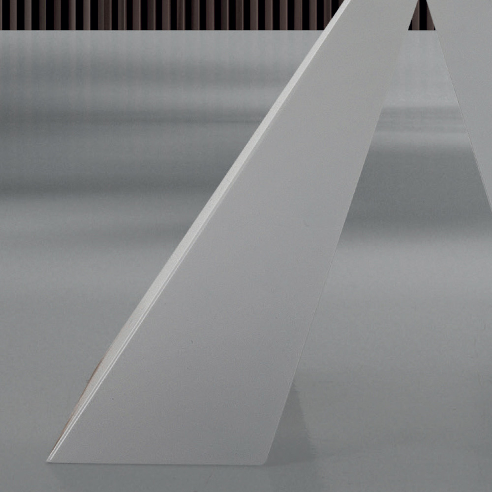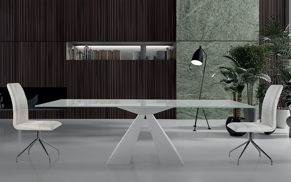 Mesa rectangular moderna, elaborada artesanalmente en Italia con vidrio templado y base de acero blanco.